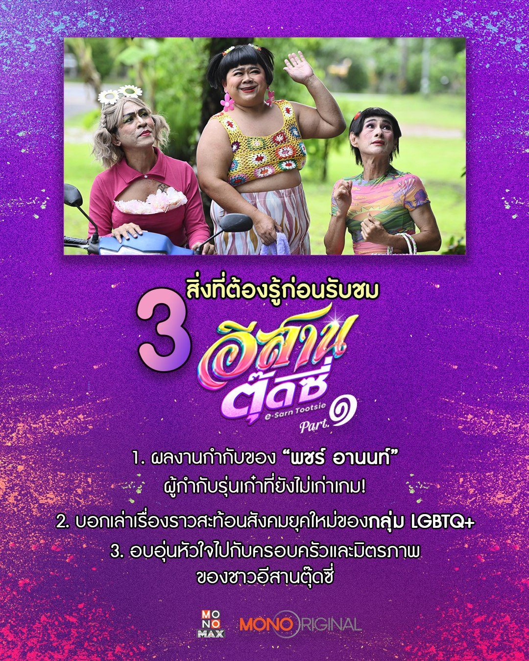หากคุณชอบหนังไทบ้านและเป็นแฟนคลับจักรวาลหอแต๋วเเตกอย่าพึ่งเลื่อนผ่าน! วันนี้เราจะพาทุกคนมาเรียนรู้ถึง 3 สิ่งที่ต้องรู้ก่อนรับชม "อีสานตุ๊ดซี่ Part 1 E-Sarn Tootsie Part 1" จากผู้กำกับ พชร์ อานนท์ นำแสดงโดย โก๊ะตี๋ อารามบอย, หลุยส์ เชิญยิ้ม, เรืองยศ สีโสฬสสกุล, วราวุธ โพธิ์ยิ้ม, แพรรี่ ไพรวัลย์ และ ต้าวหยอง ยุคลเดช 25 มกราคมนี้รับชม "อีสานตุ๊ดซี่ E-Sarn Tootsie Part 1" พร้อมกันที่ MONOMAX เท่านั้น!