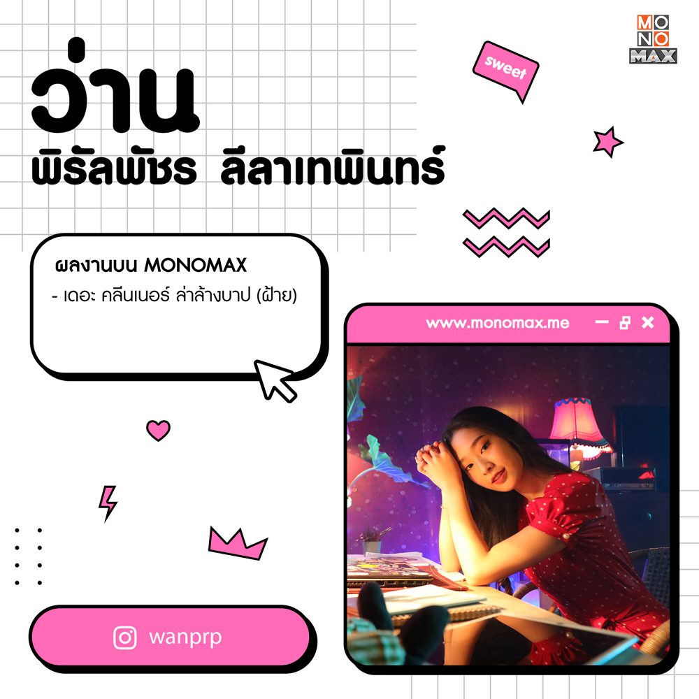 พบนางเอกสาวน้องใหม่ไฟแรง "ว่าน-พิรัลพัชร ลีลาเทพินทร์" นิสิตสาวจากรั้วจุฬาลงกรณ์มหาวิทยาลัย ที่ได้มาแสดงฝีมือรับบทเป็น ฝ้าย นางเอกผู้กุมหัวใจคลีนเนอร์ในหนัง "เดอะ คลีนเนอร์ ล่าล้างบาป" ดาเมจความความน่ารักของสาวหมวยคนนี้รุนแรงมาก ใครดูก็ต้องโดนตกเหมือนพระเอกอย่างแน่นอน