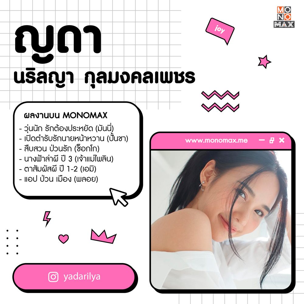 "ญดา-นริลญา กุลมงคลเพชร" สาวน้อยมากฝีมือ อนาคตไกล ใครชื่นชอบเธอคนนี้จากหนังร่างทรง ต้องลองตามมาดูบทบาทอื่น ๆ ของเธอที่ MONOMAX มีทั้งโรแมนติกวัยรุ่น อย่าง "วุ่นนักรักต้องประหยัด" "เปิดตำรับรักนายหน้าหวาน" "สืบสวนป่วนรัก" หรือจะแนวดราม่าพล็อตล้ำ "แอป ป่วน เมือง" ไปจนถึงแนวสยองขวัญ "นางฟ้าล่าผี ปี3" "ตาสัมผัสผี ปี1-2" แฟน ๆ ก็สามารถเลือกชมได้เลย ญดาเต็มที่ทุกบทบาทแน่นอน