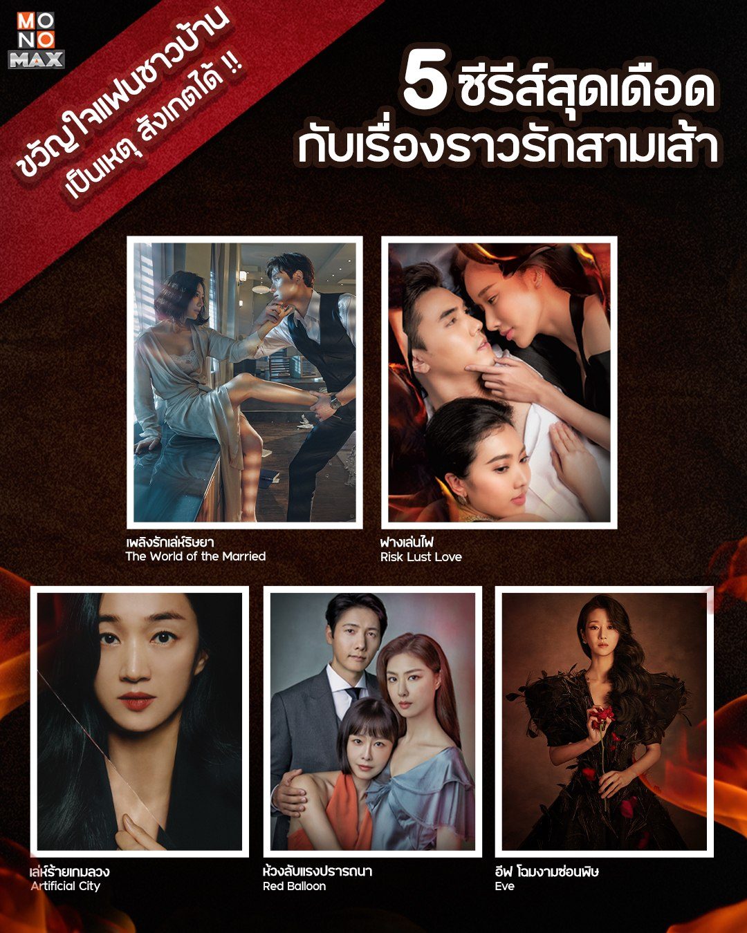 เมื่อความสัมพันธ์ไม่ได้มีเพียงแค่คนสองคน แต่ดันมีบุคคลที่สามเข้ามาเกี่ยวข้อง!! งานนี้ความรักที่แสนหวานชื่นต้องพังทลายก่อให้เกิดเป็นความแค้นที่รอวันชำระ!! ตามมารับชม 5 ซีรีส์ที่จะมาบอกเล่าเรื่องราวความรักและความแค้น! พร้อมกับเนื้อหาสุดเชือดเฉือนสะท้อนสังคม รับชมได้ในแบบฉบับพากย์ไทย-ซับไทยที่ MONOMAX