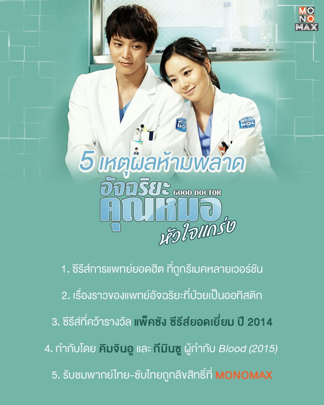Good Doctor อัจฉริยะคุณหมอหัวใจแกร่ง ซีรีส์แพทย์ยอดฮิตจากเกาหลีที่โด่งดังไปทั่วโลก จนได้รับการซื้อลิขสิทธิ์นำมารีเมคหลากหลายเวอร์ชัน วันนี้ถือโอกาสหยิบยก 5 เหตุผลที่จะบอกคุณว่าทำไมถึงห้ามพลาดชมซีรีส์น้ำดีเรื่องนี้! พากย์ไทย-ซับไทยเริ่ม 6 กุมภาพันธ์นี้ที่ MONOMAX