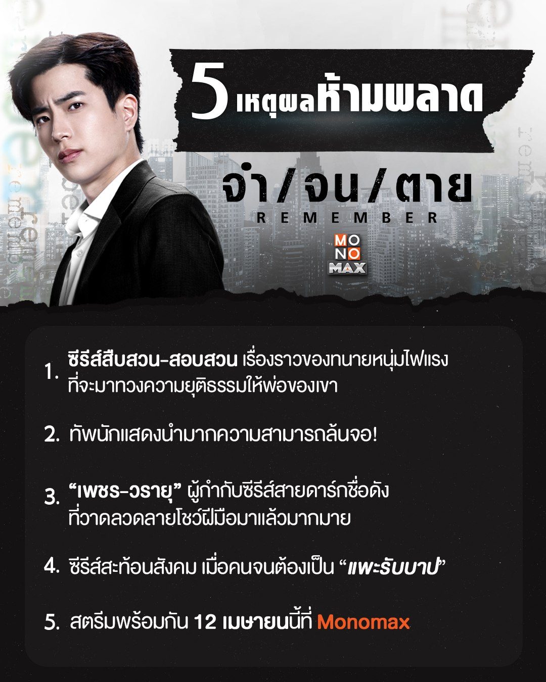 รับชมเรื่องราวสุดเข้มข้นได้พร้อมกันใน จำ จน ตาย Remember เริ่มสตรีมวันที่ 12 เมษายน อัปเดต 2 ตอนใหม่ทุกวันศุกร์ เวลา 10.00 น. ที่ Monomax ที่เดียว