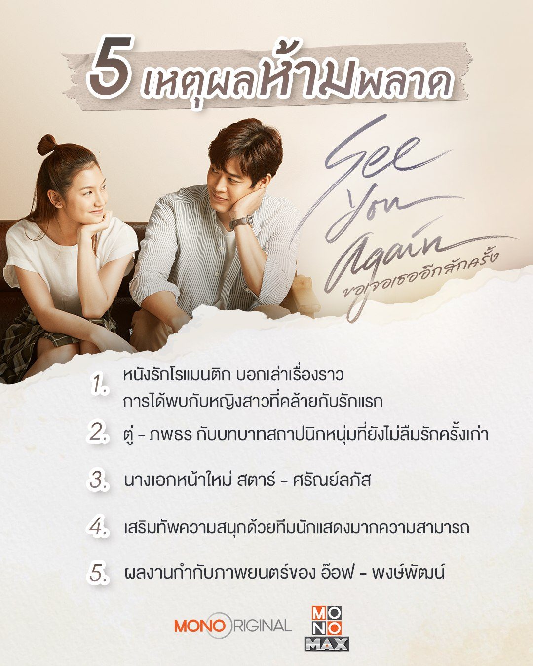 8 ธันวาคมนี้เตรียมพบกับหนังรักโรแมนติกสุดซึ้ง บอกเล่าเรื่องราวความรักระหว่างสถาปนิกสุดเหงาผู้มั่นคงในรักแรกกับหญิงสาวที่เข้ามาแต่งแต้มความสดใสในชีวิตเขา วันนี้เลยหยิบยก 5 เหตุผลที่จะบอกว่าทำไมคุณถึงห้ามพลาดชมหนังดีเรื่องนี้ ติดตามต่อแบบเต็มเรื่องได้ใน "ขอเจอเธออีกสักครั้ง SEE YOU AGAIN" ที่ MONOMAX เท่านั้น!!