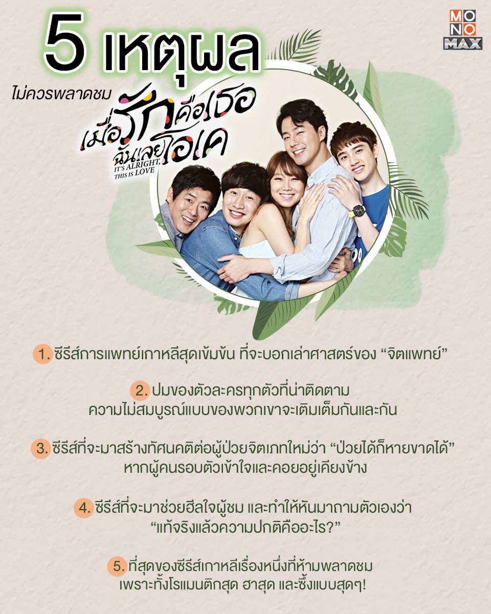 "เมื่อรักคือเธอ ฉันเลยโอเค It's alright, This is Love" ซีรีส์เกาหลีแนวโรแมนติก-ดราม่า บอกเล่าเรื่องราวศาสตร์ของจิตแพทย์ กับ 5 เหตุผลที่จะบอกคุณว่าทำไมถึงไม่ควรพลาดชมซีรีส์สุดครบรสเรื่องนี้ ติดตามความสนุกและฟินนนไปกับเสียงไทยครบทุกตอนได้ที่ MONOMAX