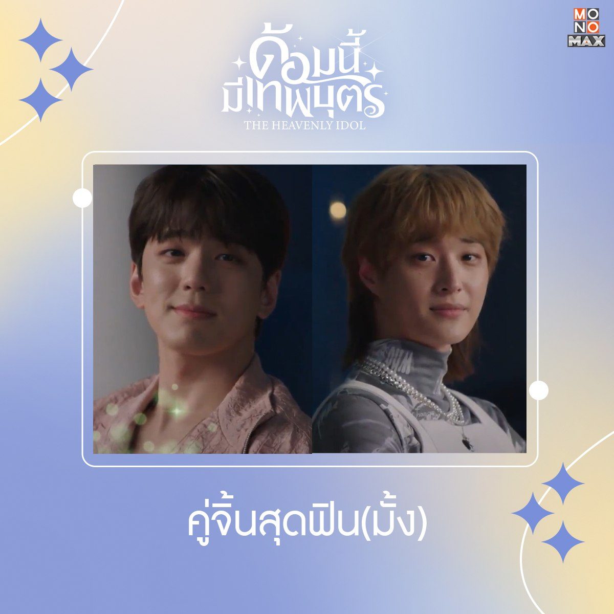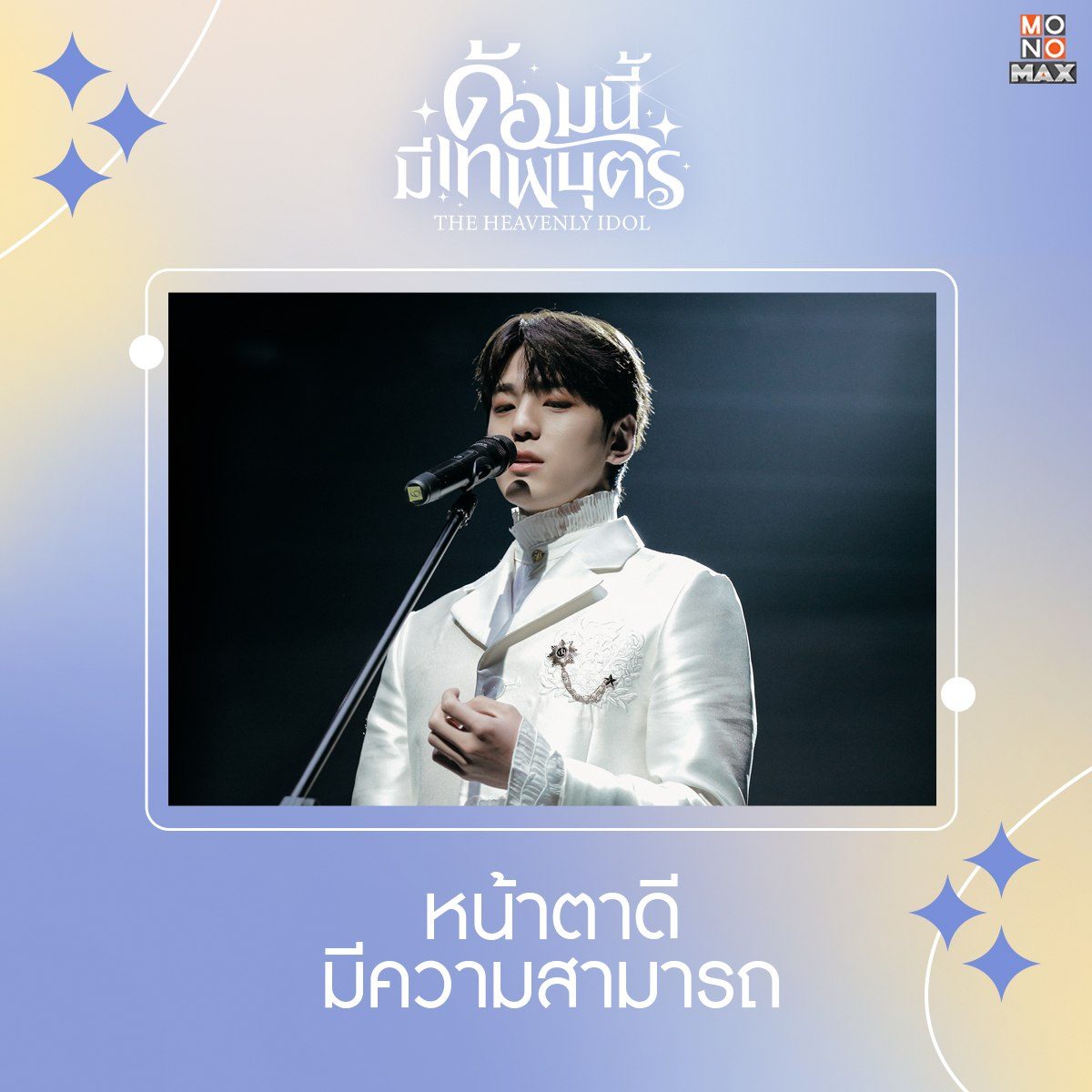 เรื่องย่อ ด้อมนี้มีเทพบุตร The Heavenly Idol: ซีรีส์แฟนตาซีเกาหลี สร้างจากเว็บตูนในชื่อ ‘Holy Idol’ ได้พระรองสุดฮ็อตที่มีกระแสโด่งดังจาก ‘Business Proposal’ อย่าง ‘คิมมินกยู’ มารับบทบาทพระเอกในครั้งนี้ อีกทั้งยังเป็นการร่วมงานกันครั้งแรกกับนางเอกสาว ‘โกโบกยอล’ โดยซีรีส์ ‘The Heavenly Idol’ เล่าถึงเรื่องราวของ “แรมบรารี่” (คิมมินกยู) มหาปุโรหิตผู้รับใช้เทพเรดริน ในระหว่างที่เขากำลังต่อสู้กับซาตาน (อีจางอู) กลับเกิดเรื่องไม่คาดคิด เมื่อจู่ ๆ เขาได้ตื่นขึ้นมาในร่างของ “อูยอนอู” ไอดอลหนุ่มหล่อจากวง Wild Animal ที่วงเองก็ไม่ประสบความสำเร็จนัก จนใกล้จะยุบวง แต่ความวุ่นวายก็ได้เกิดขึ้นเมื่อเขาต้องขึ้นทำการแสดงแต่เขาดันเต้นไม่เป็น อีกทั้งคำพูดและท่าทางแปลก ๆ ของเขาก็ทำให้วงเป็นกระแสขึ้นมา! งานนี้ “คิมดัล” (โกโบกยอล) แฟนคลับผู้คลั่งไคล้อูยอนอู และเป็นแฟนคลับหนึ่งเดียวของวง ต้องมาทำหน้าที่ผู้จัดการจำเป็น ให้กับวง Wild Animal เพื่อช่วยอูยอนอูให้ใช้ชีวิตบนโลกมนุษย์ และตามหาซานตานเพื่อหยุดยั้งการทำลายโลกให้จงได้!