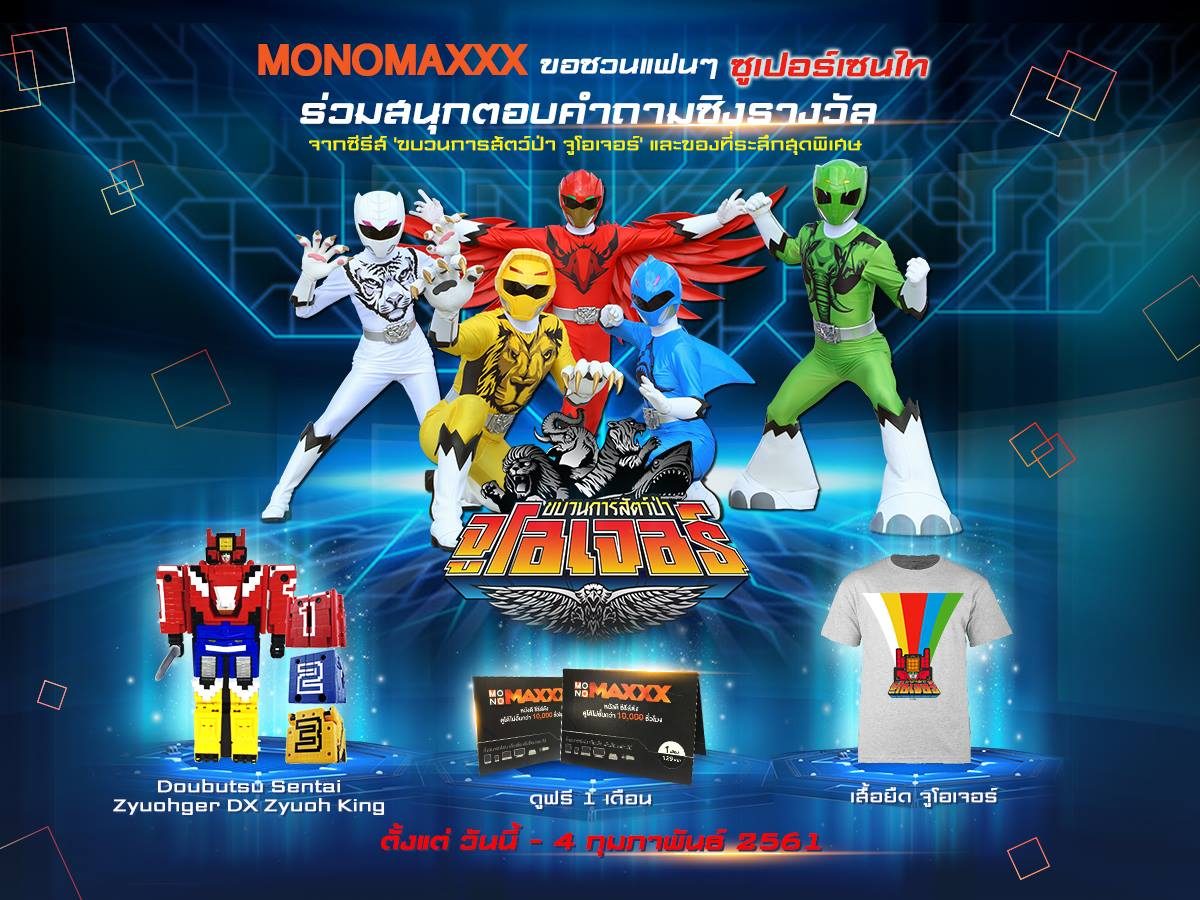 MONOMAXXX ขอชวนแฟนๆ ซูเปอร์เซนไท ร่วมสนุกตอบคำถามชิงรางวัล Doubutsu Sentai Zyuohger DX Zyuoh King และของที่ระลึกสุดพิเศษ ตั้งแต่วันนี้ - 4 กุมภาพันธ์ 2561 ดูรายละเอียด คลิกที่นี่