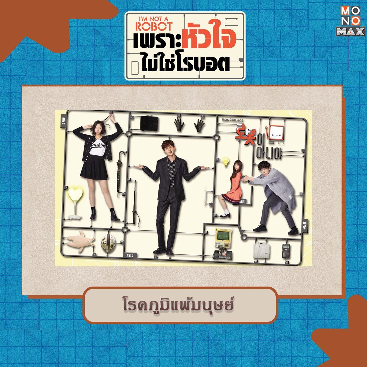6. โรคภูมิแพ้มนุษย์ เป็นโรคสมมุติจากซีรีส์เรื่อง เพราะหัวใจไม่ใช่โรบอต I'm Not a Robot คิมมินกยู (ยูซึงโฮ) เมื่อเขาได้สัมผัสกับมนุษย์ทุกคนบนโลกก็จะเกิดอาการผื่นขึ้นอย่างรุนแรง เขาจึงต้องใช้ชีวิตอยู่คนเดียวเพราะเหตุนี้เขาจึงต้องการที่จะมีหุ่นยนต์เป็นเพื่อน แต่น่าแปลกใจที่เขาไม่มีอาการแพ้ใด ๆ เมื่อสัมผัสกับ โจจีอา (แชซูบิน) หญิงสาวที่เป็นต้นแบบของหุ่นยนต์ที่สร้างขึ้นนั่นเอง