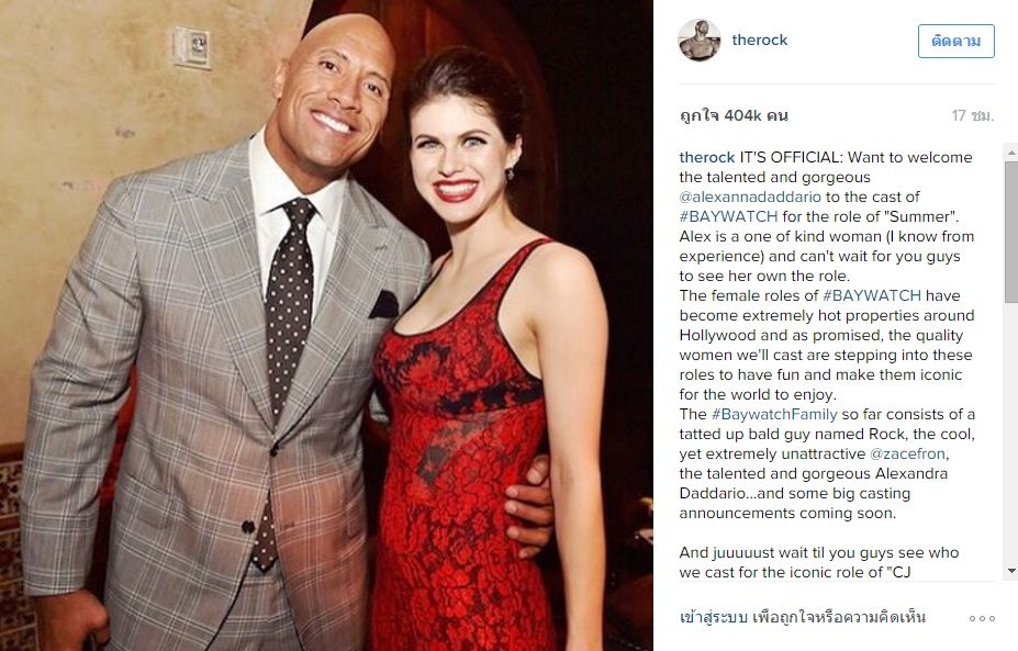 “เป็นทางการแล้ว เราขอต้อนรับ @alexannadaddario ดาราสาวแสนสวยผู้มีความสามารถมาร่วมแสดงเรื่อง #BAYWATCH ในบท “ซัมเมอร์” อเล็กเธอเป็นผู้หญิงที่ใจดีคนหนึ่ง (จากประสบการณ์ของผม) และเราก็รอไม่ไหวแล้วที่จะเห็นเธอแสดงในบทนี้”