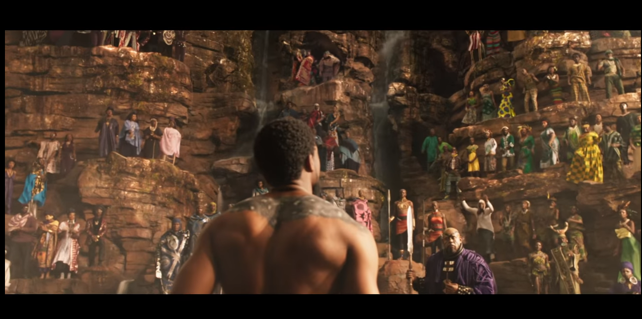 เบื้องหน้า Black Panther คือผู้คนมากมายตะโกนโห่ร้อง น่าจะเป็นการท้าชิงตำแหน่งแบล็คแพนเธอร์ โดยมี ซูริ ผู้เป็นลุงยืนอยู่ด้านขวาด้วย
