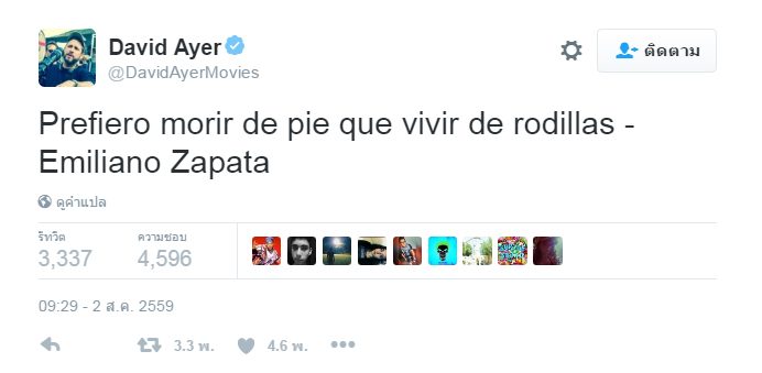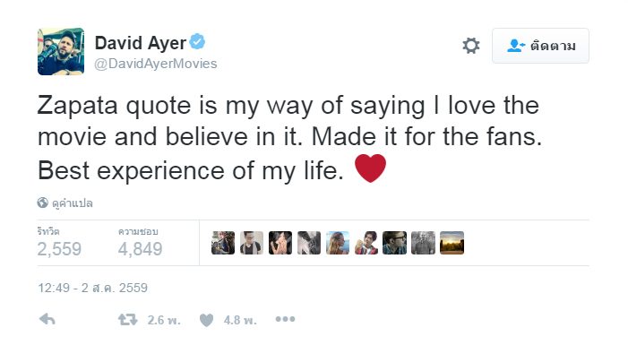 โดยคำพูดดังกล่าวสามารถแปลออกมาได้ว่า "ยอมตายด้วยเท้าของตัวเอง ดีกว่าอยู่อย่างคุกเข่าให้กับคนอื่น" (ยอมยืนหยัดในความคิดของตัวเอง ดีกว่าทำตามความคิดของคนอื่น) ซึ่งหลังจากนั้นไม่กี่ชั่วโมงเดวิด เอเยอร์ก็ออกมาทวิตอีกรอบด้วยข้อความว่า "คำของซาปาตาคือวิธีการของผมที่พูดว่าผมรักหนังเรื่องนี้และก็เชื่อมั่นไปกับมัน ผมทำหนังเรื่องนี้ให้กับแฟน ๆ และมันก็เป็นประสบการณ์ที่ดีที่สุด heart"