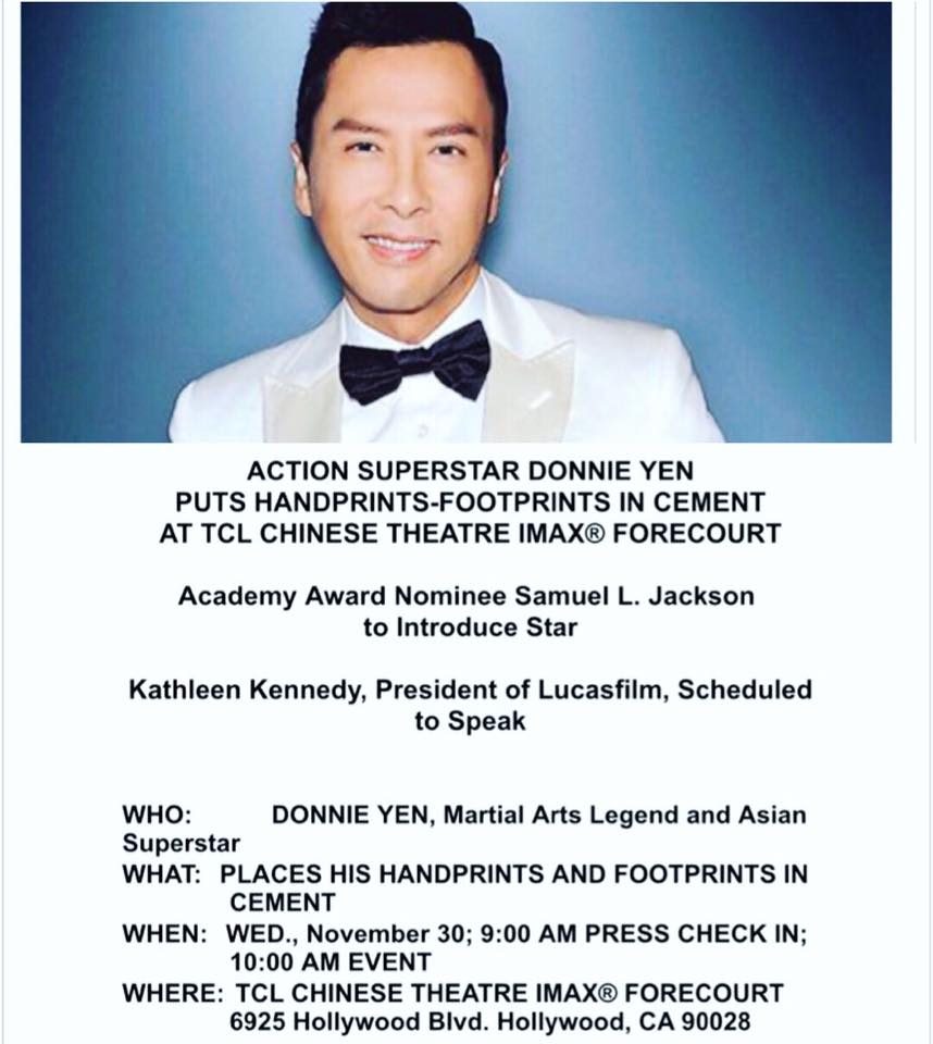 ซึ่งดอนนี่ เยนจะไปประทับฝ่ามือที่ ทีซีแอล ไชนีส เธียเตอร์ ในวันที่ 30 พฤศจิกายน 2016 โดยภายในงานจะมี ซามูเอล แอล. แจ็คสัน มาเป็นผู้เรียนเชิญ และได้ตัว แคทลีน เคนเนดี ประธานลูคัสฟิล์มเป็นผู้ร่วมพูดคุย