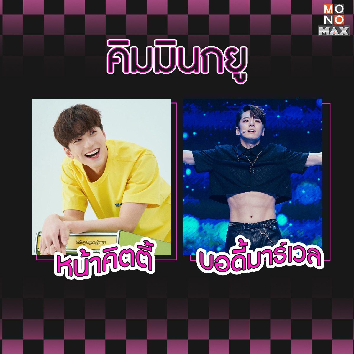 คิมมินกยู (Kim Min-Kyu) | ใครจะไปรู้ว่าภายใต้ใบหน้าที่ยิ้มแย้ม แถมมีลักยิ้มละลายใจของหนุ่มมินกยู แท้จริงแล้วเขามีซิกแพคชวนหลงไหลซ่อนอยู่?!! งานนี้ใครไหวไปก่อนเล้ยยย แต่ทางนี้อยู่ไม่ไหวแล้ววว