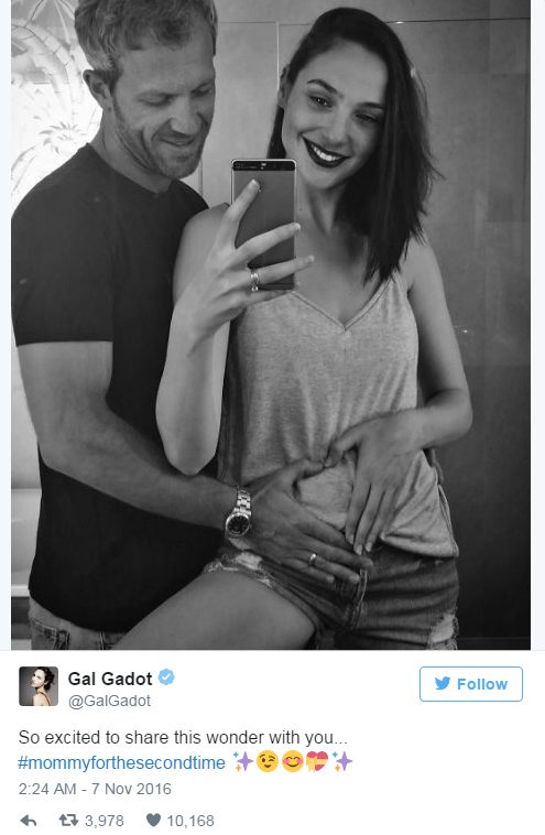 เมื่อเร็ว ๆ นี้ กัล กาดอท นักแสดงผู้รับบทวันเดอร์วูแมนใน Batman v Superman ได้ใช้ทวิตเตอร์ส่วนตัวโพสต์รูปคู่กับ ยารอน เวอร์ซาโน ผู้เป็นสามี พร้อมเผยแพร่ข่าวดีว่าตนตั้งท้องลูกคนที่สอง โดยเธอเขียนข้อความเอาไว้ว่า "รู้สึกตื่นเต้นอย่างยิ่งที่จะได้แชร์ข่าวน่าอัศจรรย์นี้กับคุณ #ตั้งท้องลูกคนที่สองแล้ว"