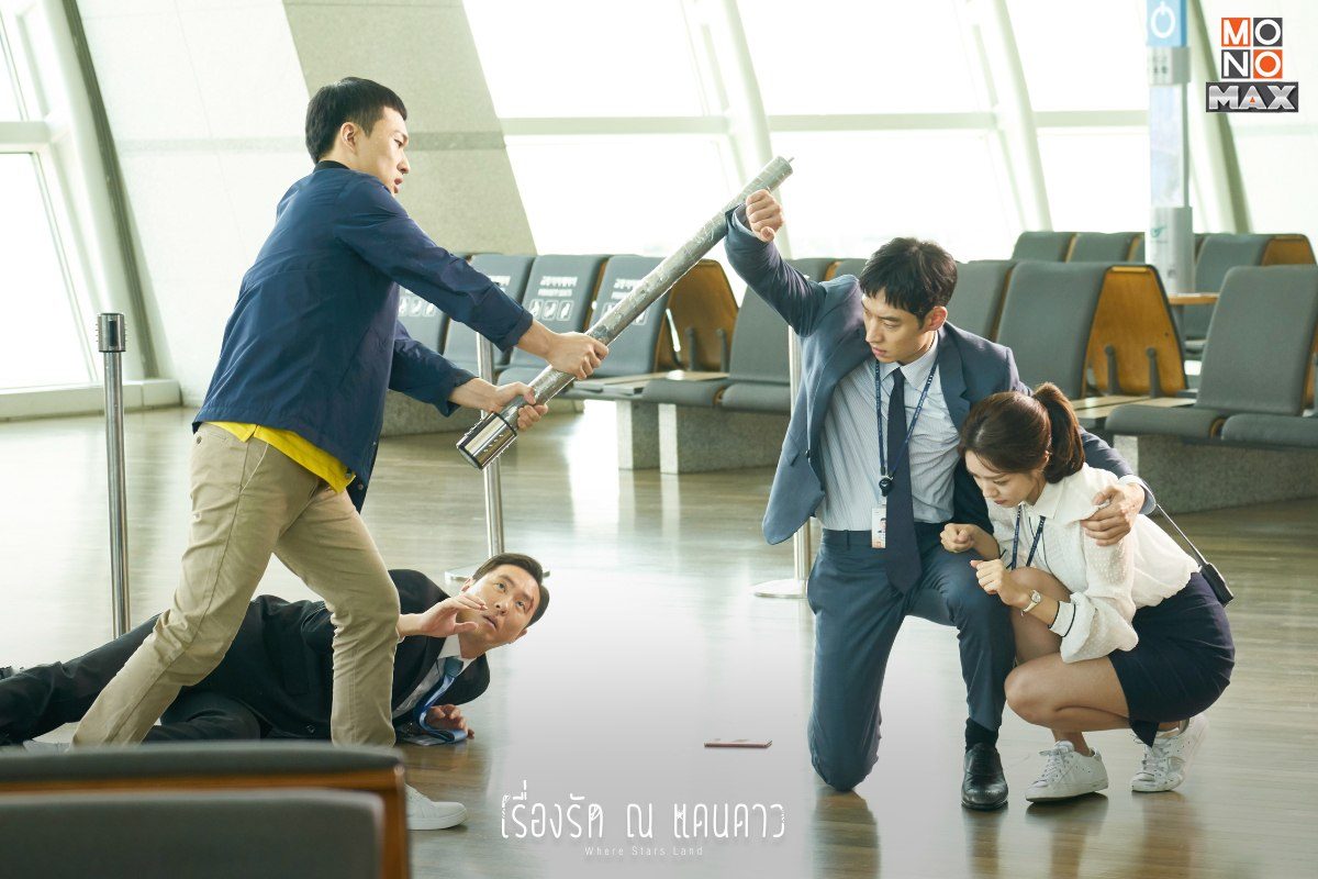 เรื่องย่อ เรื่องรัก ณ แดนดาว Where Stars Land - 'Where Stars Land เรื่องรัก ณ แดนดาว' ซีรีส์โรแมนติกผลงานการเขียนบทโดย 'คังอึนคยอง' ที่เธอเคยฝากผลงานซีรีส์ดัง ๆ มาแล้วมากมาย อาทิ "Dr. Romantic 1-2" ในครั้งนี้เราจะได้พบกับเรื่องราวความรักของเหล่าเจ้าหน้าที่ประจำท่าอากาศยานอินชอน ฮันยอรึม (แชซูบิน) หญิงสาวที่มีความฝันและมุ่งมั่นที่จะทำงานในสนามบิน จนเธอได้ทำงานที่สนามบินอินชอน แต่ด้วยความที่เธอค่อนข้างเป็นคนซุ่มซ่าม ก่อเรื่องจนถูกผู้โดยสารร้องเรียนหลายครั้ง ทำให้ถูกย้ายมาอยู่ทีมภาคพื้นและได้พบกับอีซูยอน (อีเจฮุน) พี่เลี้ยงหนุ่มมาดขรึมที่ไม่ค่อยสุงสิงกับใคร ในที่แรกอีซูยอนค่อนข้างที่จะรำคาญฮันยอรึมเพราะเธอมักจะก่อเรื่องให้ปวดหัวอยู่บ่อยครั้ง แต่เมื่อเธอต้องพบกับเรื่องราวอันตรายก็เป็นอีซูยอนที่เข้าไปช่วยเธอ ทำให้ฮันยอรึมเริ่มสนใจในตัวของอีซูยอน และพบว่าก็เป็นเขาคนนี้ที่เคยช่วยเธอไว้เมื่อหนึ่งปีก่อน ในระหว่างนั้นอีซูยอนก็ได้กลับมาพบกับ ซออินอู (อีดงกอน) พี่ชายต่างแม่ผู้ทำให้ชีวิตของเขาต้องเปลี่ยนไปตลอดกาล