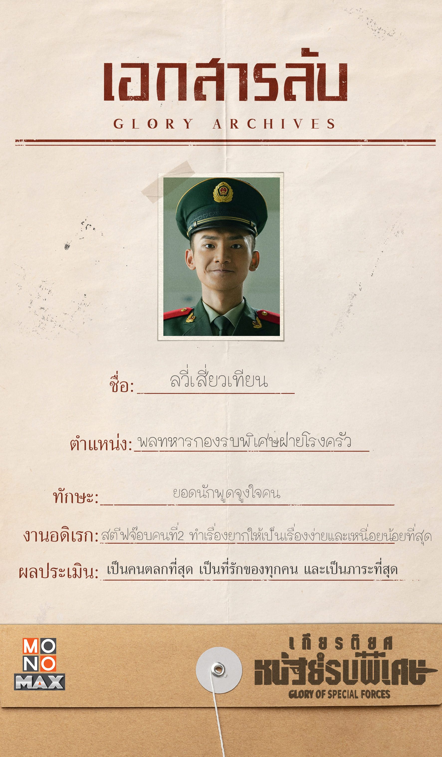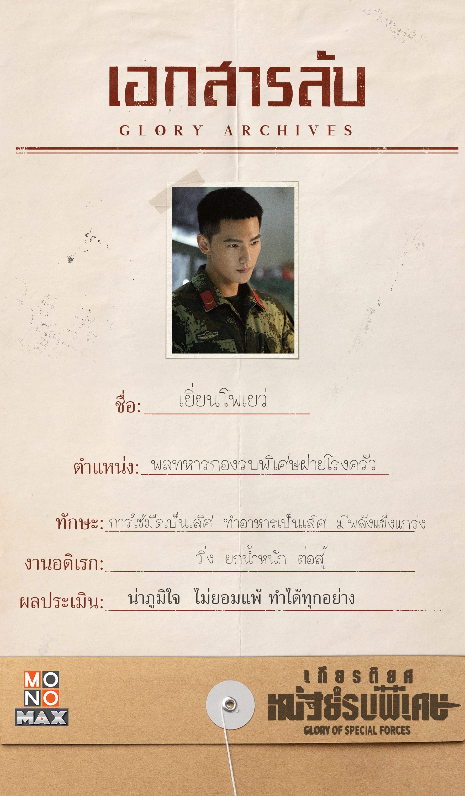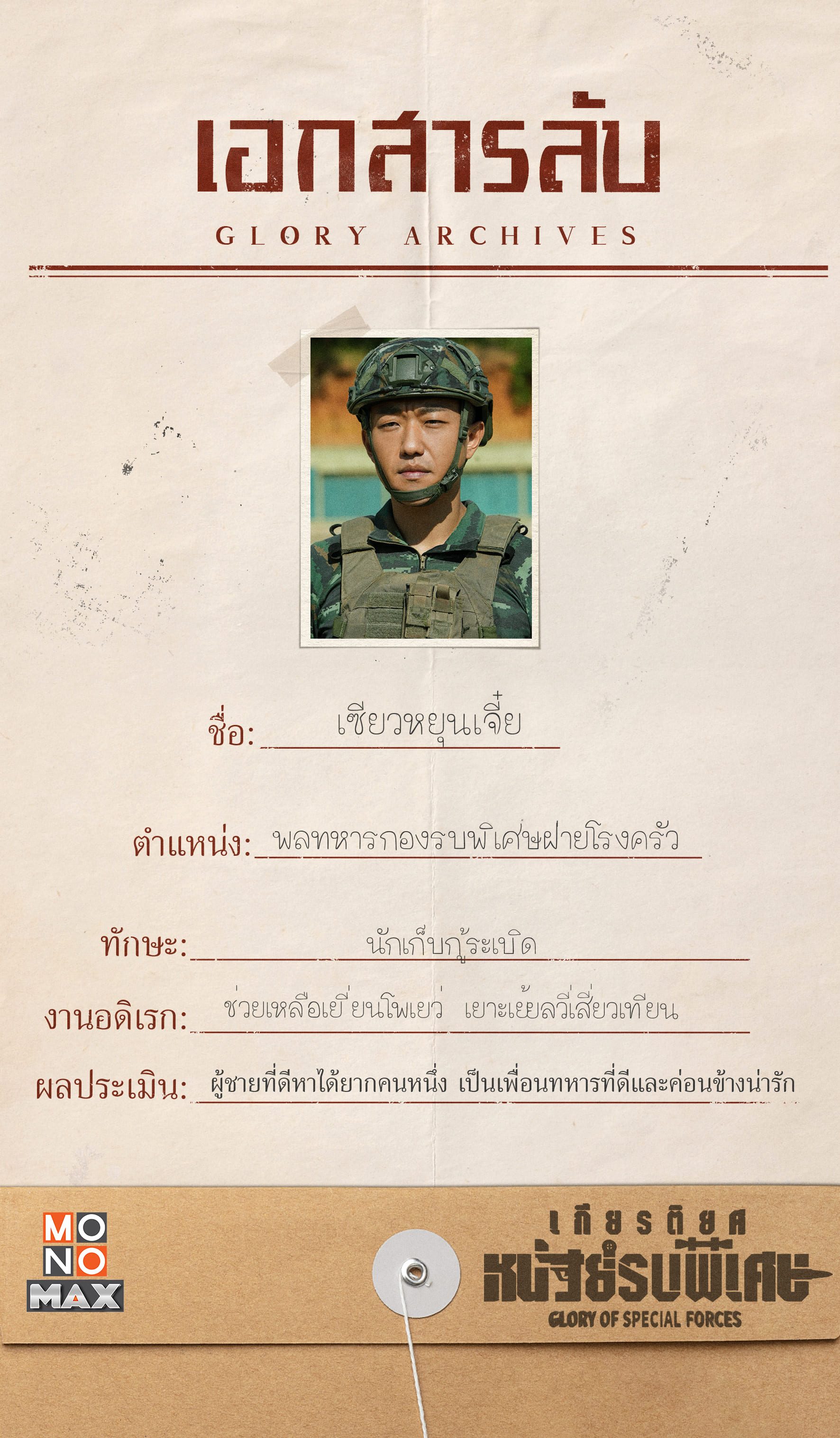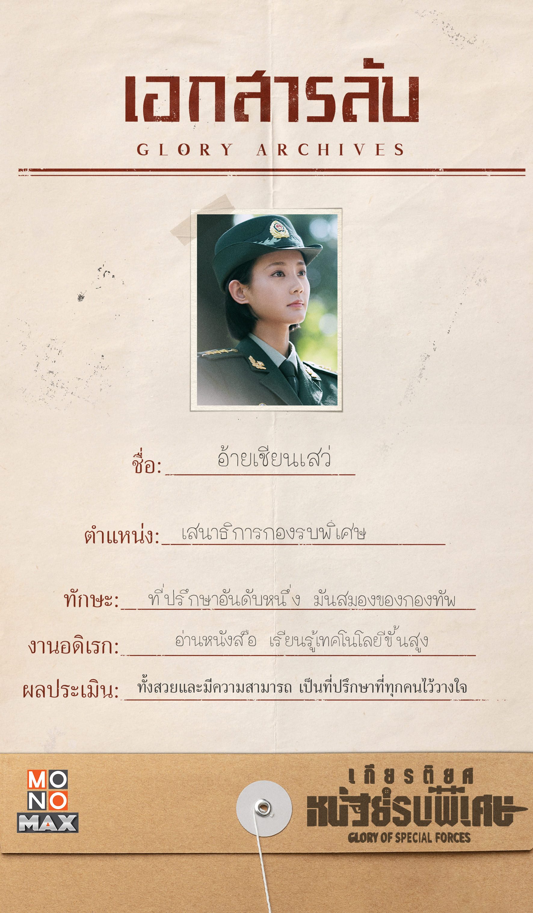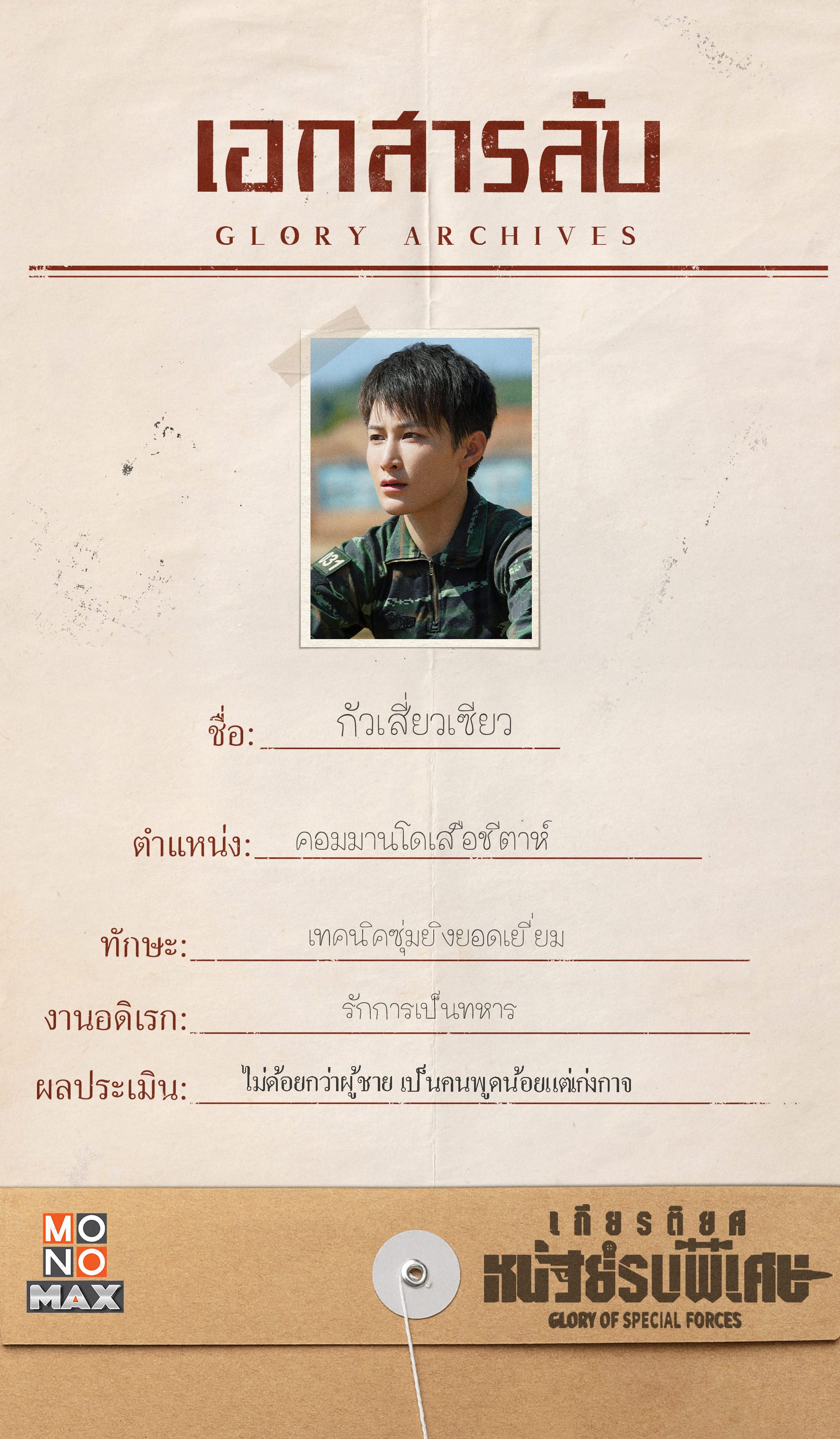 ส่องแฟ้มลับ เปิดข้อมูลสุดเอ็กซ์คลูซีฟของ 6 นายทหารระดับท๊อป ตามไปดูแล้วเตรียมลุยทุกภารกิจไปด้วยกันในซีรีส์ เกียรติยศหน่วยรบพิเศษ Glory of Special Forces รับชมความมันส์ด้วยกันได้แล้ววันนี้ที่ MONOMAX