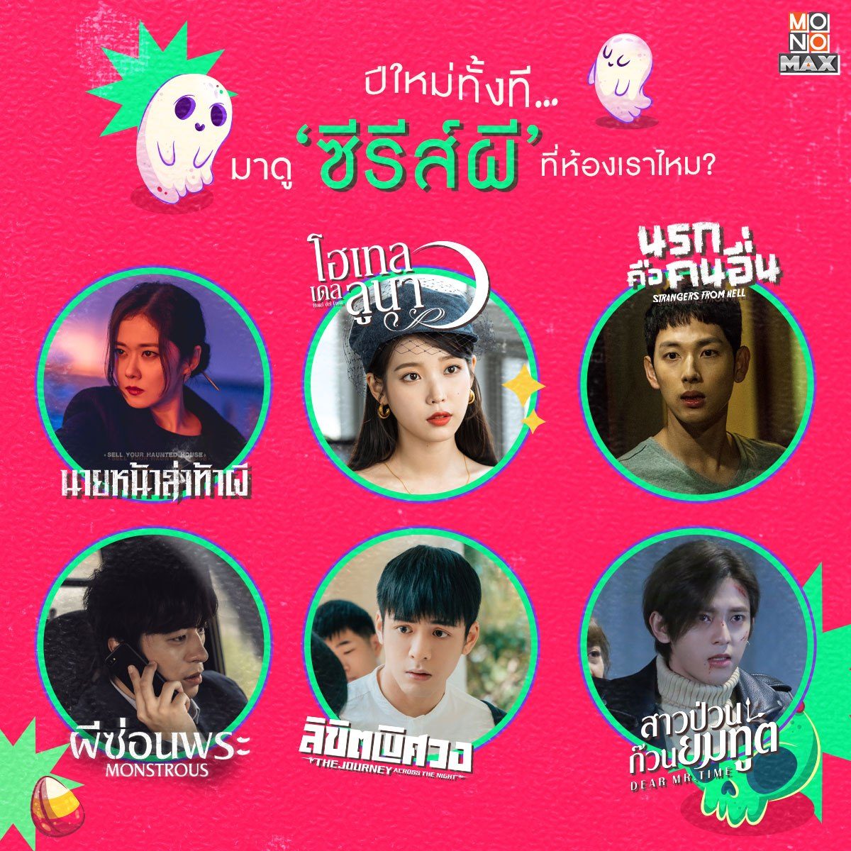 ปีใหม่นี้ ชวนทุกคนเปลี่ยน mood เอาใจสายชอบซีรีส์ระทึกขวัญ วันนี้เรารวบรวม 'ซีรีส์ผี' ให้ทุกคนเอาไว้หลอกเธอคนนั้นมาดูเป็นเพื่อนที่ห้อง ข้ออ้างดีขนาดนี้เขาต้องมาแล้วล่ะ! แล้วอย่าลืมนะว่าให้เป็นแค่ผีที่หลอกก็พอ เธออย่ามาหลอกกันเลย... ทั้งนี้รับชมซีรีส์แบบฉบับพากย์ไทย-ซับไทยได้ทุกเรื่องที่ MONOMAX