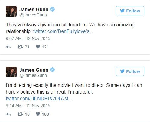 ด้านการทำงานกับสตูดิโอค่ายยักษ์ใหญ่อย่าง Disney เจมส์ กันน์ก็เผยออกมาว่าเขาได้อิสระในการทำงานอย่างเต็มที่ เขาสามารถทำหนังที่เขาอยากทำได้ และพวกเขาก็มีความสัมพันธ์ที่ดีต่อกัน