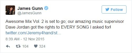 และอีกหนึ่งสิ่งที่เป็นเอกลักษณ์ของ GOTG ก็คือเพลงประกอบภาพยนตร์ โดยเจมส์ กันน์ก็ทวิตบอกข่าวดี ๆ กับแฟน ๆ ว่าเพลงทุกเพลงที่เขาอยากได้มาใส่ใน Awesome Mix Vol. 2 ได้ลิขสิทธิ์มาครบทุกเพลงแล้ว