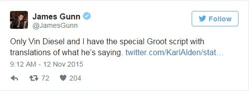 โดยเริ่มจากเจมส์ กันน์ได้ตอบคำถามของแฟน ๆ ว่ามีแต่เขากับ วิน ดีเซล เท่านั้นที่เข้าใจว่า Groot พูดอะไร