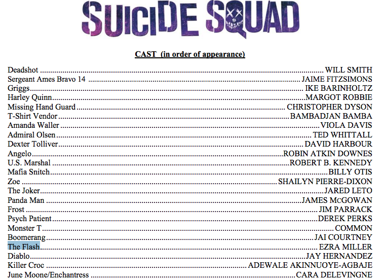 อย่างที่เราได้ทราบกันดีว่า แบทแมน ที่แสดงโดย เบน เอฟเฟล็ก จะมาปรากฏตัวอีกครั้งใน Suicide Squad ซึ่งล่าสุดเว็บไซต์ Hollywood Reporter  ก็ออกมารายงานว่านอกจากแบทแมนแล้ว เดอะแฟลชก็จะไปโผล่ในหนังรวมทีมวายร้ายเช่นกัน ซึ่งไม่ใช่ฉาก End Credit แต่อย่างใด นอกจากนี้ทาง Comicbook.com ก็ออกมายืนยันประเด็นนี้ โดยได้เผยรายชื่อนักแสดงที่จะเข้าฉากซึ่งมีชื่อของ เอสล่า มิลเลอร์ ผู้รับบทเดอะแฟลชอยู่ในนั้น