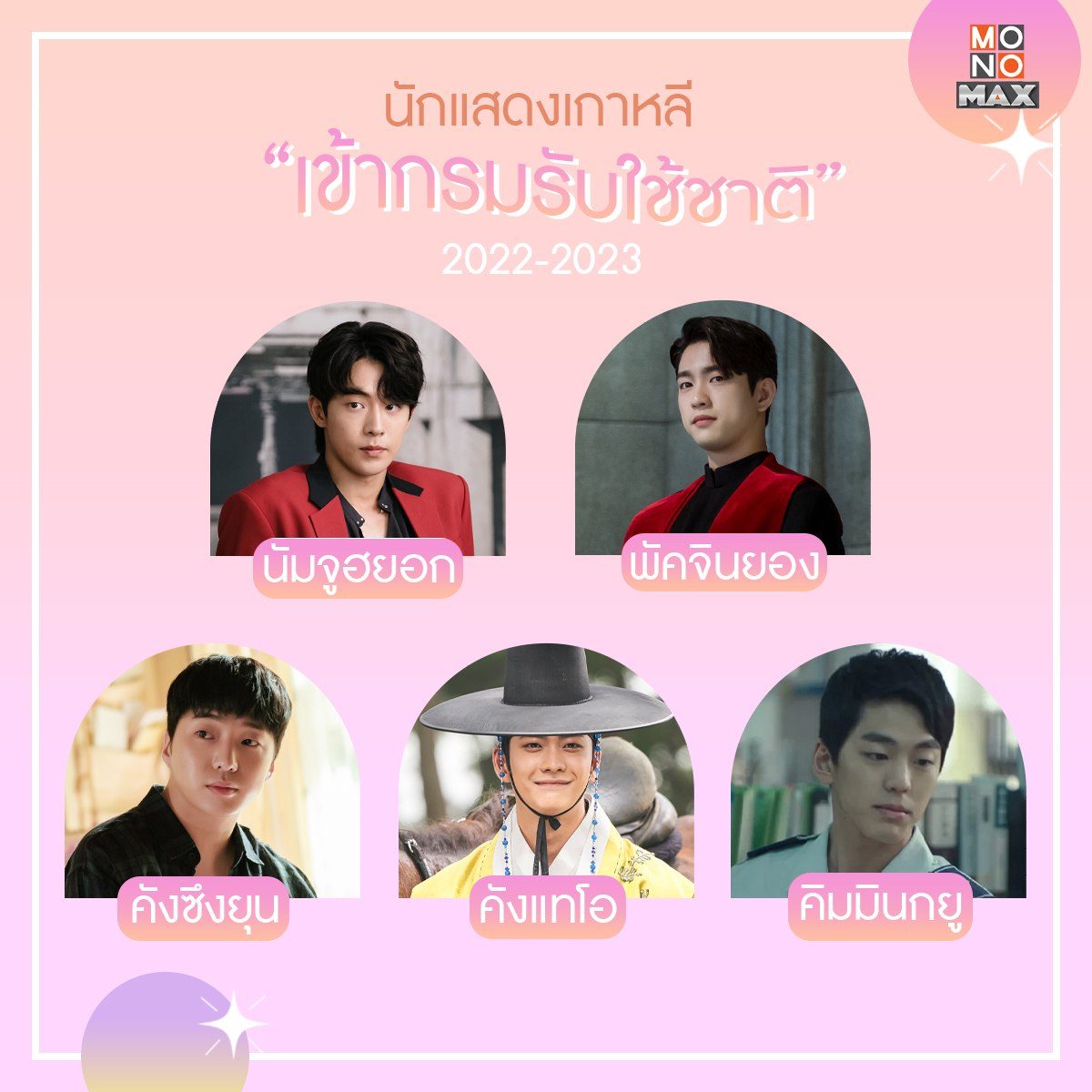ทำเอาเหล่าสาวๆ เศร้าซึมกันเลยทีเดียว เมื่อได้ทราบข่าวว่าเหล่านักแสดงมากมายที่เป็นขวัญใจผู้ชม ต่างพากันพักงานลาไปเข้ากรมรับใช้ชาติในปีหน้า! วันนี้เราจึงรวบรวมหนุ่มๆ ที่จะไม่ได้เห็นหน้ากันไปสักพัก มาให้รับชมผลงานกันให้หายคิดถึง งานนี้จะมีหนุ่มๆ จาก MONOMAX คนไหนบ้าง ตามมาดูและติดตามซีรีส์เกาหลีพากย์ไทยของพวกเขาได้ทุกเรื่องที่ MONOMAX
