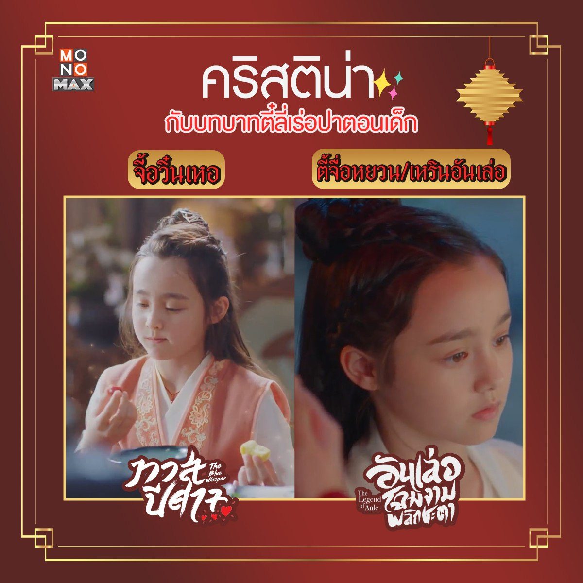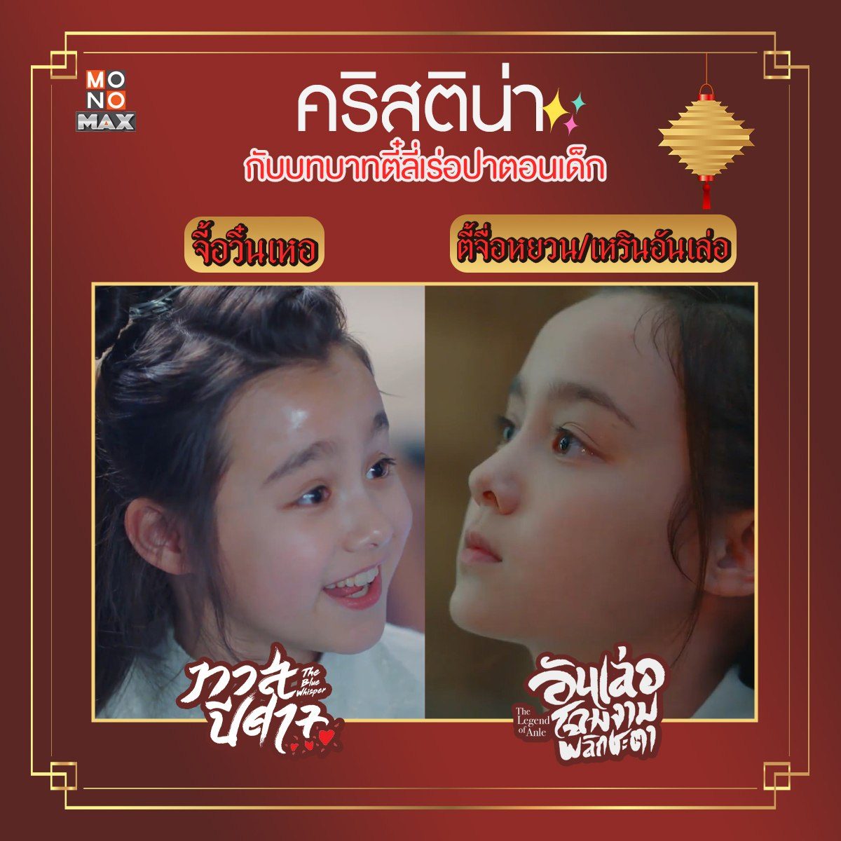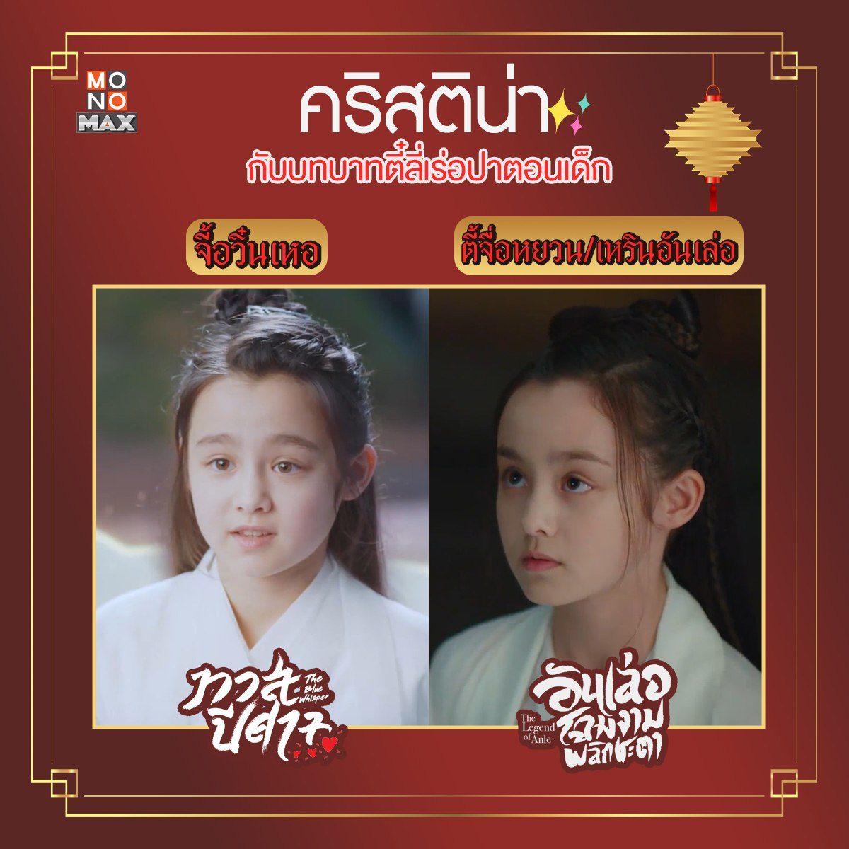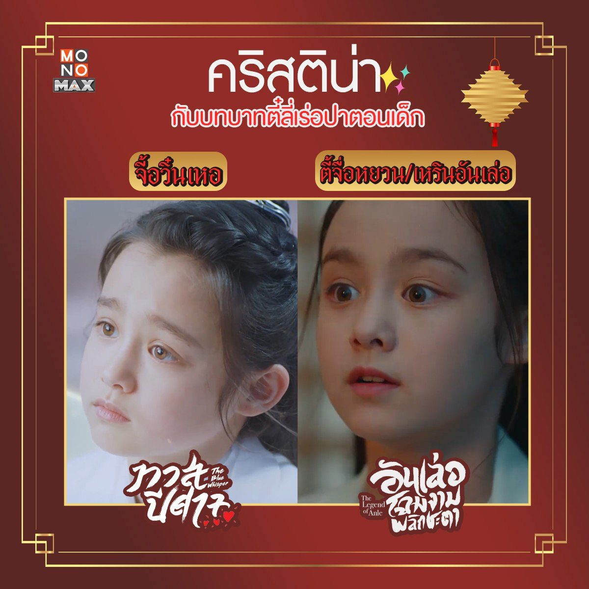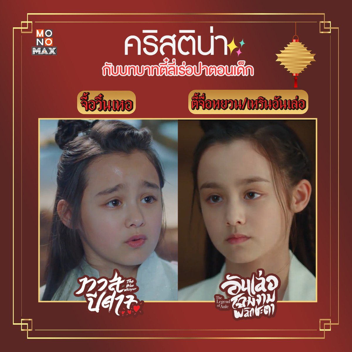 เทียบให้เห็นภาพกันแบบชัดๆ กับสองบทบาทของนักแสดงเด็ก "คริสติน่า" ที่รับบทเป็น "ตี๋ลี่เร่อปา" ตอนเด็กมาแล้วถึง 2 เรื่องด้วยกัน! ตามไปชมฝีมือการแสดงของเธอได้ในซีรีส์จีน "ทาสปีศาจ The Blue Whisper" และ "อันเล่อ โฉมงามพลิกชะตา The Legend of Anle" พากย์ไทยแบบจุใจที่ MONOMAX