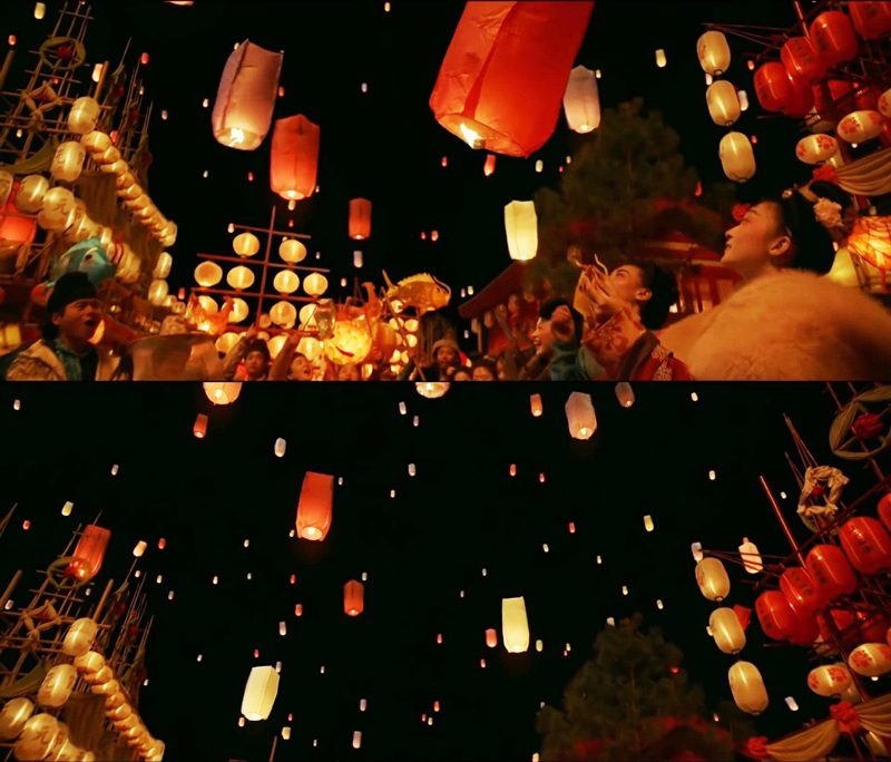 พูดถึงซั่งหยวนแล้ว ก็ต้องนึกถึงโคมไฟ เพราะชาวฉางอันทำโคมไฟเก่งที่สุด ทุกตรอกซอกซอยต่างประดับประดาไปด้วยโคมไฟ พอปลายยามโหย่วก็เริ่มจุดกันแล้ว โคมไฟแต่ละทิศส่องแสงสว่างไปทั้งเมือง ยามที่โคมไฟถูกจุดขึ้น แสงที่กระทบภูเขาราวกับคบเพลิง มองเห็นแสงสว่างเป็นร้อยลี้แจ่มชัดกว่าแสงจันทร์ แสดงให้เห็นถึงความยิ่งใหญ่ของต้าถัง