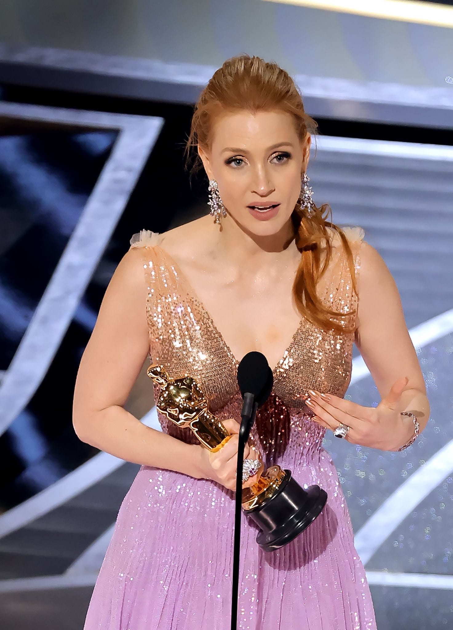 เจสสิกา แชสเทน ได้รางวัลนักแสดงนำหญิงตัวแรกมาครองได้สำเร็จจากบทบาทของเธอในภาพยนตร์เรื่อง The Eyes of Tammy Faye หลังจากที่เธอเคยได้มีชื่อเข้าชิงมา 2 รอบแล้วในภาพยนตร์เรื่อง Zero Dark Thirty และ The Help