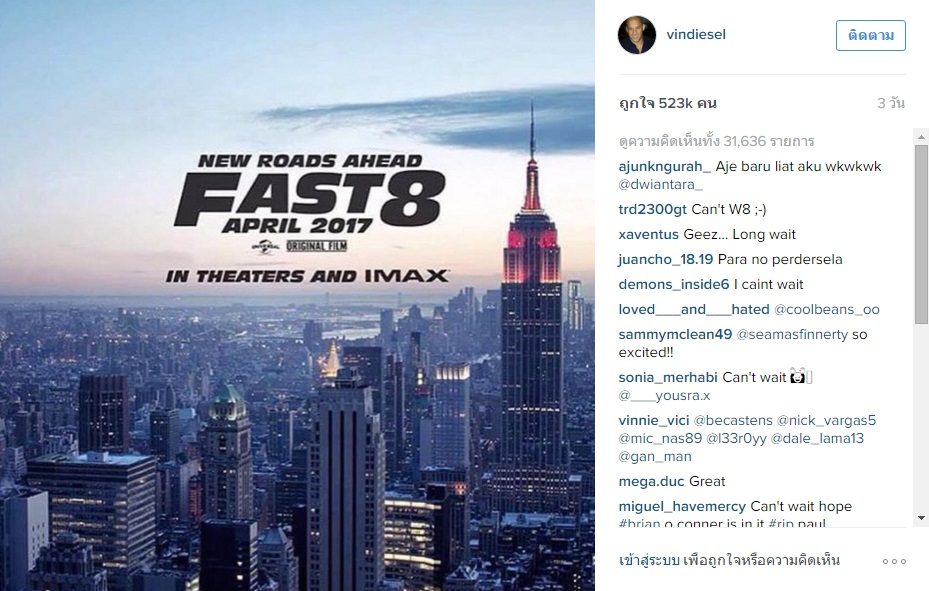 Vin Diesel ปล่อยโปสเตอร์แรก Fast 8 พร้อมอัพเดทความคืบหน้าภาพยนตร์รถซิ่ง