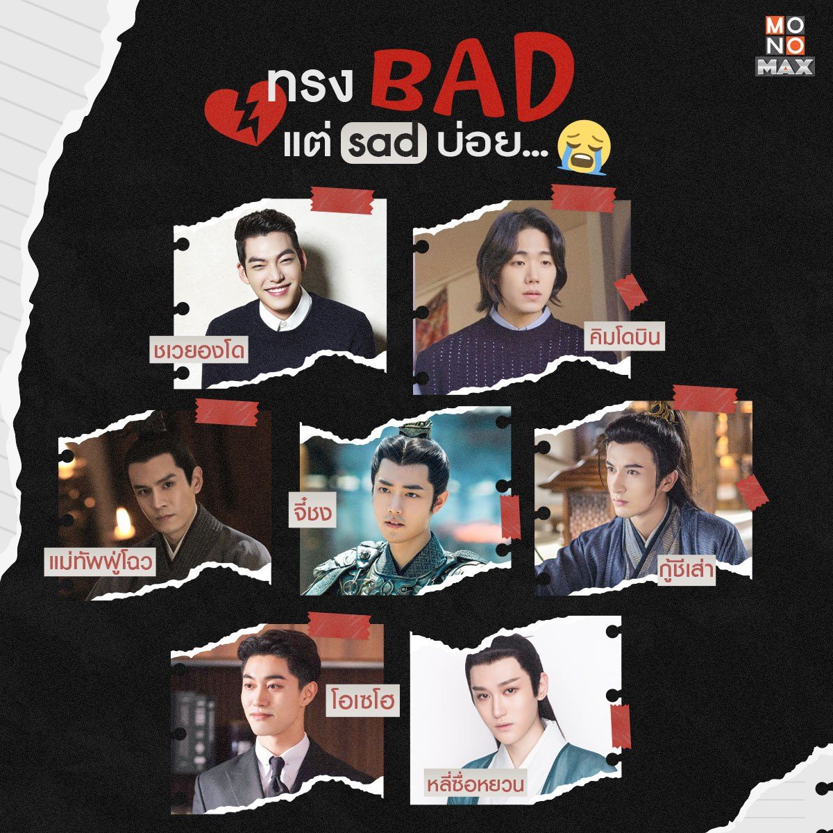 ใครจะไปคิดว่าหนุ่มๆงานดี ทรง Bad Boy แบบพวกเขาเหล่านี้ ที่จริงแล้วต่างโดนนางเอกเททิ้งเหมือนเทน้ำ!! วันนี้เราจึงรวบรวมเหล่าพระเอกทรงแบด แต่ความจริงแล้วพวกเขา 'แซด' อย่างบ่อย มาให้ทุกคนได้ปลอบประโลมใจพ่อหนุ่มแบดบอยเหล่านี้กัน และขอยืนยันเลยว่าแบดแค่ลุคเท่านั้น เพราะความจริงแล้วพวกเขานั้นเป็น 'Good Boy' ของจริงต่างหาก!! ติดตามซีรีย์พากย์ไทยของพวกเขาได้ทุกเรื่องที่ MONOMAX