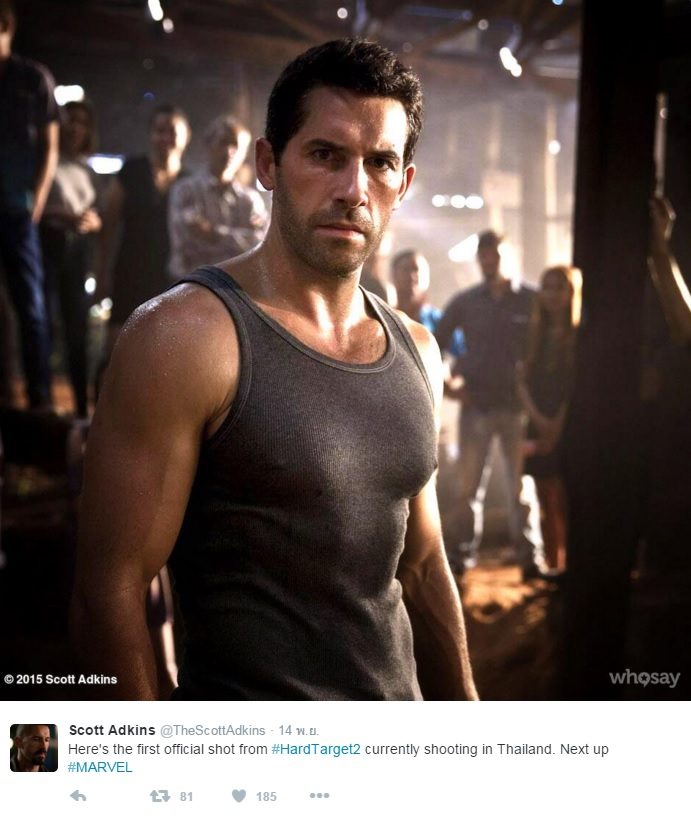 ซึ่งข่าวนี้ก็ไม่ใช่ข่าวลืออีกต่อไปเมื่อวันที่ 15 พฤศจิกายนที่ผ่านมา สก๊อต แอดกินส์ ได้ทวิตภาพตัวเองถ่ายทำภาพยนตร์เรื่อง Hard Target 2 ในเมืองไทยพร้อมกับข้อความว่า “นี้คือรูปอย่างเป็นทางการรูปแรกจากเรื่อง #HardTarget2 ที่กำลังถ่ายที่เมืองไทย และสถานนีต่อไปก็คือ #Marvel”