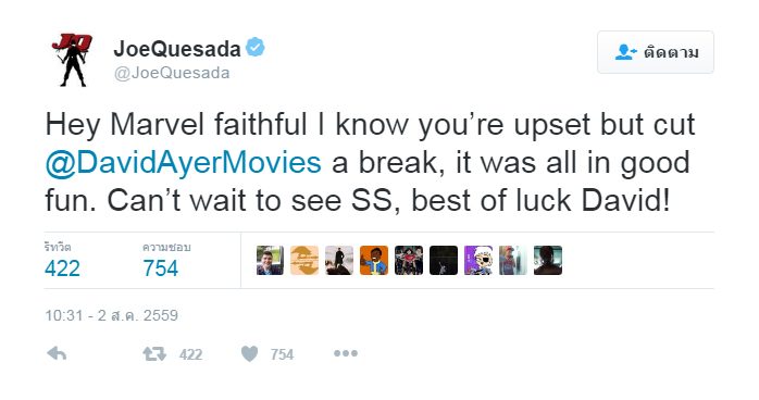 "แฟน ๆ Marvel ผมรู้ว่าคุณไม่พอใจกับเรื่องนี้ แต่ให้ @DavidAyerMovies ได้พักบ้าง ทั้งหมดมันก็แค่ความบันเทิงแหละ อดใจรอดู Suicide Squad ไม่ไหวแล้ว ขอให้โชคดีนะเดวิด"