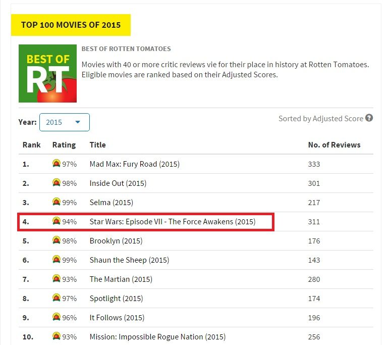 ส่วนอีกเว็บดังอย่าง ROTTEN TOMATOES ที่ถือว่าเป็นเว็บปราบเซียนของแท้ เพราะมีแต่นักวิจารณ์ระดับตัวเป้งมาคอยรีวิว และลงคะแนน แต่ก็ไม่ได้เป็นปัญหาให้กับ Star Wars: The Force Awakens แต่อย่างใด เพราะนักวิจารณ์ต่างเทคะแนนให้อย่างท่วมท้น 94% อยู่อันดับที่ 4. ของภาพยนตร์ที่ทำคะแนนสูงสุดในปี 2015 เป็นรองแค่หนังเข้าชิงรางวัลที่ถูกคอนักวิจารณ์อย่าง Selma, Inside Out และ Mad Max: Fury Road เท่านั้น ถึงตอนนี้ก็แค่รอลุ้นว่าปีหน้า Star Wars: The Force Awakens จะได้เบียดเข้าชิงรางวัลใหญ่อย่างออสการ์ด้วยหรือไม่? หลังจากโกยคะแนนจาก 2 เว็บไซต์ภาพยนตร์ชื่อดังไปอย่างล้นหลาม ต้นปีหน้าต้องมาลุ้นกันอีกที