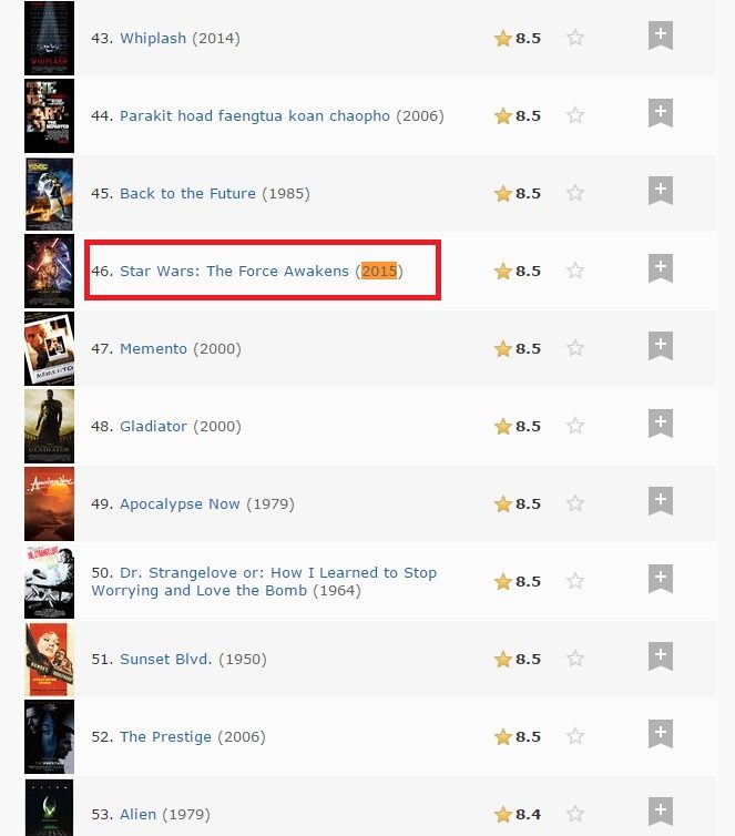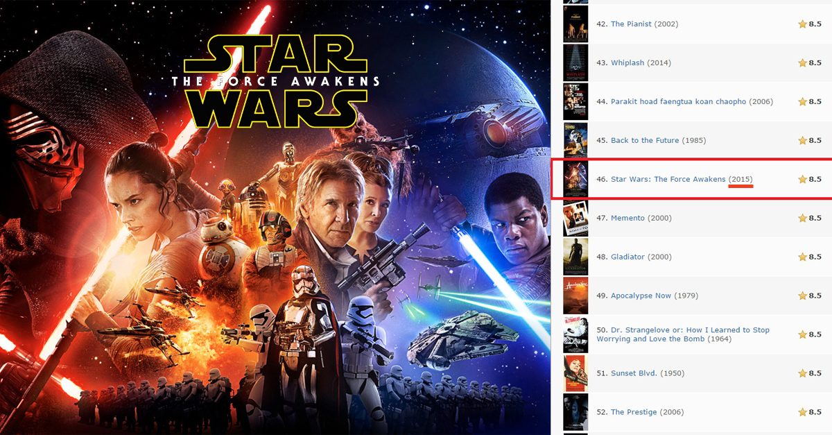 โดยภาพยนตร์ Star Wars: The Force Awakens ล่าสุดโกยคะแนนในเว็บไซต์ชื่อดังอย่าง IMDb ไปได้ถึง 8.5 คะแนน ซึ่งติดอันดับภาพยนตร์ที่ทำคะแนนสูงสุดในปี 2015 เป็นอันดับ 1. แซงภาพยนตร์ทุกเรื่องที่เข้าฉายในปี 2015 ไปทุกเรื่อง ทั้งที่เข้าฉายไปได้ไม่ถึงเดือน และทะยายขึ้นมาสู่อันดับที่ 46. ภาพยนตร์ที่โกยคะแนสูงสุดตลอดกาลของเว็บไซต์ IMDb ด้วย