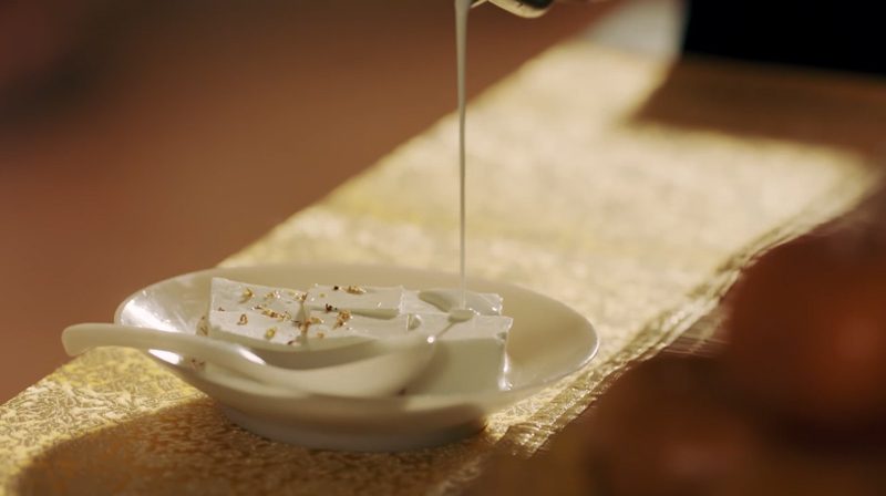 ขนมนึ่งจากเตาร้อนๆ ราดด้วยนมน้ำเชื่อมเย็นๆ มีรสหวาน ตัดด้วยความขมเล็กน้อยจากสุราชั้นดีทำให้ไม่หวานเลี่ยนจนเกินไป สุดท้ายก็โรยหน้าด้วยถั่วงาและดอกกุ้ยฮวา อร่อยเลิศล้ำทานถ้วยเดียวยังไงก็ไม่เคยพอ!
