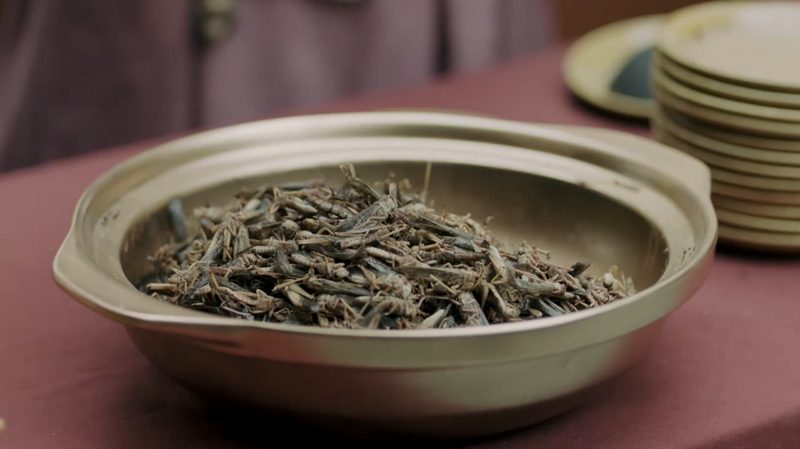 ต่อมาก็เป็นเมนูตั๊กแตนทอด ที่เชฟหยุนเยี่ยคิดได้ตอนแก้ปัญหาฝูงตั๊กแตนบุกถล่มสวนพืชผักชาวบ้านเสียหาย ถ้ามันมีมากมายก็จับมาทอดกินเสียเลย รสชาติเค็มๆ มันๆ หวานๆ อร่อยเพลินจนลืมตัว อาหารจานนี้แซ่บถูกปากจนขนาดฮ่องเต้ยังตกพระทัย
