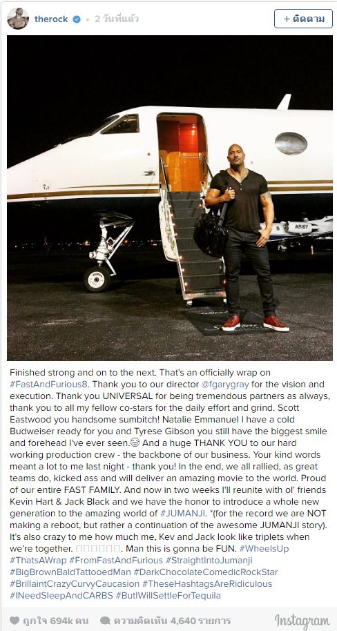 "เสร็จสิ้นกับการงานอันหนักหน่วงและเตรียมพร้อมกับงานต่อไป สิ้นสุดอย่างเป็นทางการเสียทีสำหรับ #FastandFurious8 ต้องขอขอบคุณผู้กำกับของเรา @fgarygray สำหรับวิสัยทัศน์และการถ่ายทำ" ก่อนที่ ดเวย์น จอห์นสัน จะเขียนต่อไปอีกว่า "ขอบคุณค่าย UNIVERSAL ที่อยู่แนบชิดเคียงข้างมาโดยตลอด ขอบคุณนักแสดงร่วมคนอื่น ๆ ที่ทำงานหนักในทุก ๆ วัน สก็อตต์ อีสต์วูดนายมันหล่อเป็นบ้าเลยวะ นาตาลี เอมมานูเอล ฉันมีเบียร์บัดไวเซอร์เย็น ๆ ให้เธอด้วย และ ไทรีส กิบสัน นายเป็นคนที่มียิ้มและหน้าผากที่กว้างที่สุดเท่าที่เคยเห็น และต้องขอบคุณทีมงานอีกด้วย พวกเขาคือกระดูกสันหลังของงานเรา"