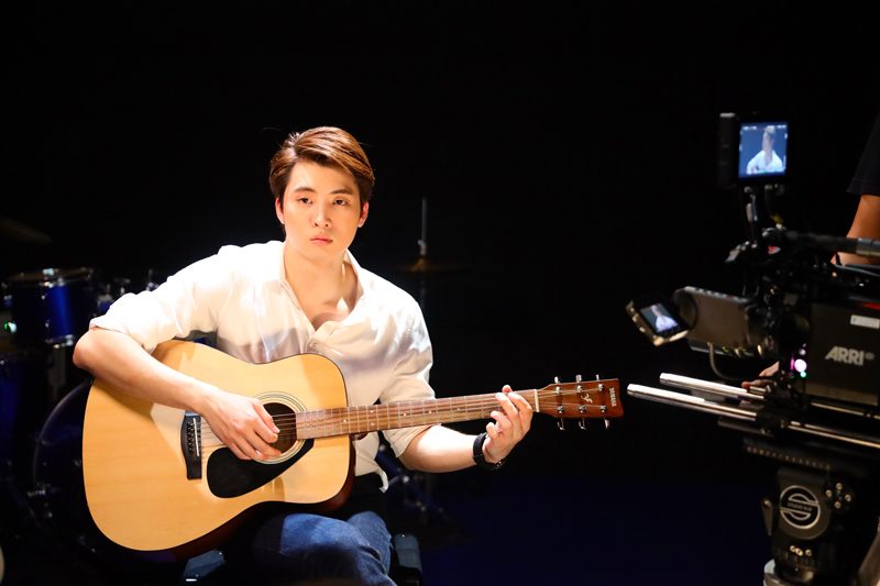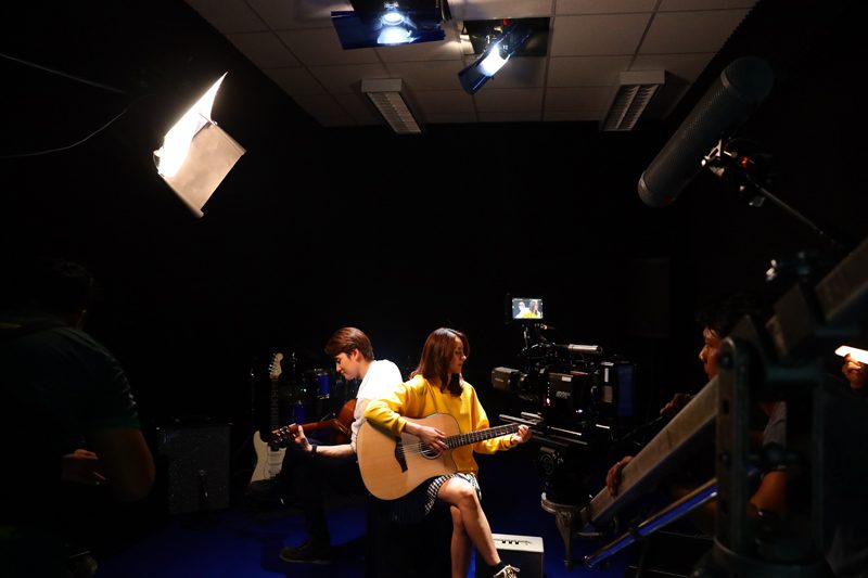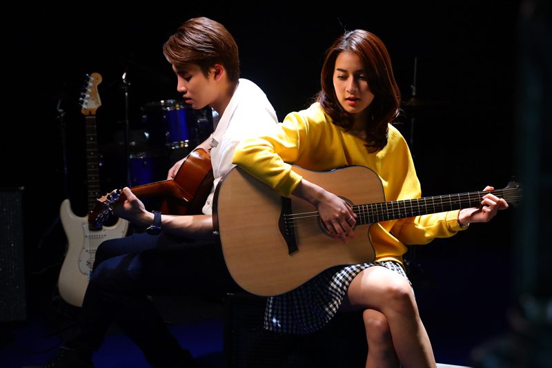 ฉากนี้ทีมงานยกกองกันไปถ่ายที่โรงเรียนสาธิตนานาชาติพระจอมเกล้าลาดกระบัง ซึ่งทั้ง “มีน” และ “ถุงแป้ง” มีพื้นฐานการเล่นกีต้าร์อยู่แล้ว ผู้กำกับเต๊ะ (ศตวรรษ เศรษฐกร) จึงเลือกเพลง “ความรักดีๆ อยู่ที่ไหน” ของ “พีธ พีระ” มาให้ซ้อมกีต้าร์ให้คุ้นมือ และเล่นให้เข้าขาสอดคล้องกัน  หลังจากซ้อมเสร็จ จึงเริ่มถ่ายจริง  ทั้งคู่เข้าไปนั่งประจำที่หันหลังพิงกัน แล้วก็เริ่มโซโล่กันถ่ายทอดอารมณ์ทั้งมีความสุข และเศร้า ตากล้องเก็บภาพคู่, ภาพเดี่ยว มุมต่างๆ ทั้งหันมาสบตาแอบซึ้งเล็กๆ ให้ได้ฟิน เล่นไปเล่นมา “ถุงแป้ง” เกิดเล่นผิดนิดหน่อย แต่ผู้กำกับฯ ก็ไม่ได้สั่งคัท แต่ปล่อยให้ทั้งสองโซโล่กันไปเรื่อยๆ เพื่ออารมณ์จะได้ต่อเนื่อง งานนี้ ทีมงานได้ฟังเพลงกันเพลินๆ เรียกว่าฉากนี้ชิลล์สุดตั้งแต่ถ่ายมาก็ว่าได้ หลังถ่ายเสร็จ “ถุงแป้ง” กล่าวว่า