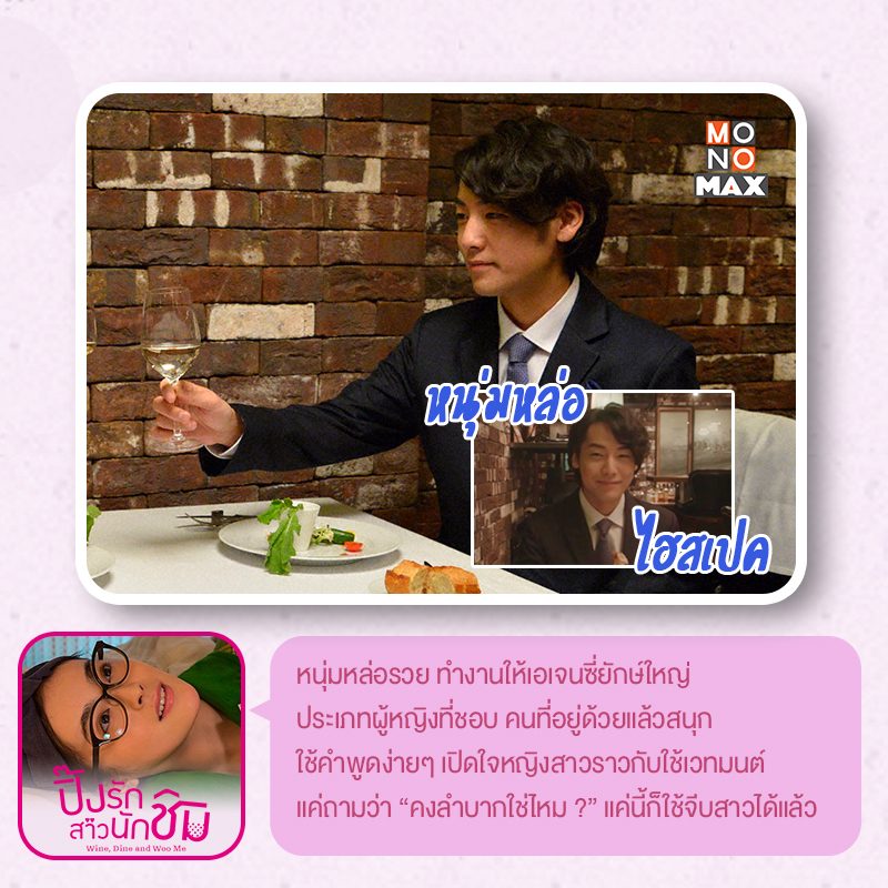 หนุ่มไฮสเปค (High Spec) ทำงานให้เอเจนซี่ยักษ์ใหญ่ ประเภทผู้หญิงที่ชอบคนที่อยู่ด้วยแล้วสนุก ใช้คำพูดง่ายๆ เปิดใจหญิงสาวราวกับใช้เวทมนต์ เพราะโดยธรรมชาติสำหรับผู้หญิงที่ชอบเม้าท์ การพูดหยอดที่ดีจะช่วยให้บทสนทนาลื่นไหล ผู้ชายทุกคน ถ้าดินเนอร์และจีบสาว ขอให้เอา 3 คำนี้ไปใช้ด้วย คงลำบากน่าดู คงลำบากใช่ไหม และคงลำบากแย่เลยสิ คำถามง่ายๆ แต่ได้ใจสาวๆ และปิดด้วยคำพูดสุดท้าย “ผมจะปกป้องคุณเอง” เป็นการเผด็จศึก