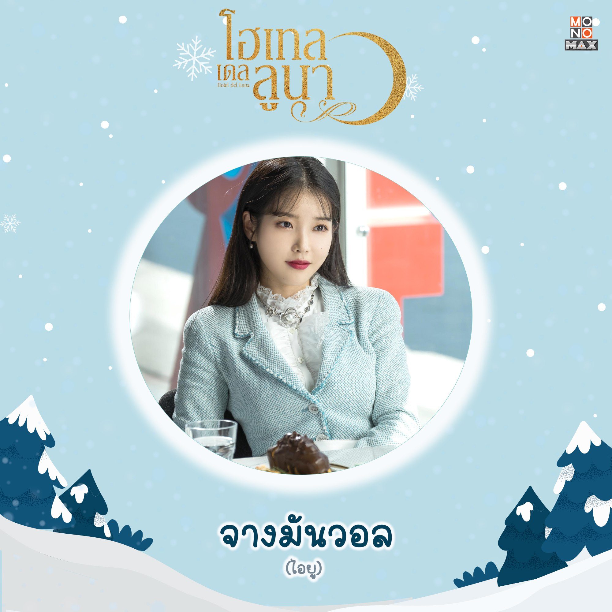 จางมันวอล (ไอยู) | สาวสวยพันปีที่มีหน้าที่ดูแลโรงแรมที่เปิดบริการให้แก่เหล่าภูติผี 'โฮเทล เดล ลูนา' เธอมากับแฟชั่นหน้าหนาวที่ให้ลุคน่ารักๆกับมินิเดรสสีฟ้าพาสเทล เพิ่มความแพงด้วยเสื้อลูกไม้คอเต่าสีขาว และเครื่องประดับ