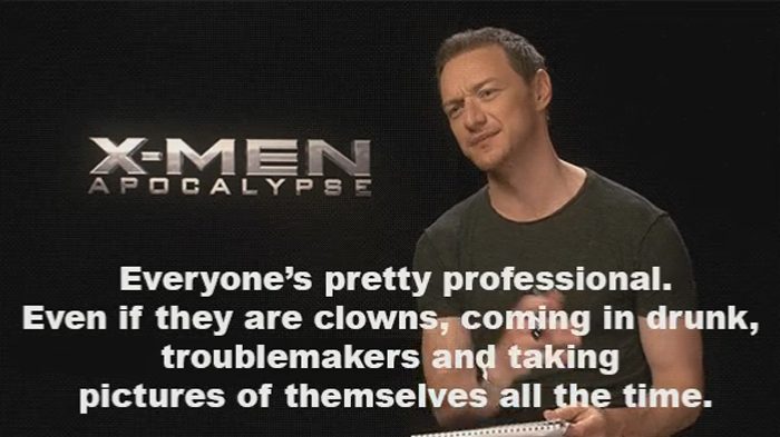 เมื่อเร็ว ๆ นี้ เจมส์ แม็คอะวอย ผู้รับบท ชาร์ลส์ ซาเวียร์ ในเรื่อง X-Men: Apocalypse ได้ออกมาตอบคำถามกับ BuzzFeed UK เกี่ยวกับพฤติกรรมนักแสดงในกองถ่าย ซึ่งใครจะมีพฤติกรรมยังไง เรามาดูกันเลย