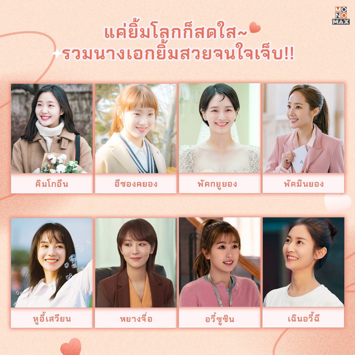 นอกจากเรื่องหน้าตาความสวยที่ไม่เป็นสองรองใครแล้ว พวกเธอยังมีอาวุธลับประจำตัวนั่นก็คือ "รอยยิ้ม" ที่ทำเอาแฟนๆซีรีส์ใจละลายไปตามๆกัน หากใครตกหลุมรักรอยยิ้มของพวกเธอก็สามารถติดตามผลงานซีรีส์ในแบบฉบับพากย์ไทย-ซับไทยกันได้ที่ MONOMAX
