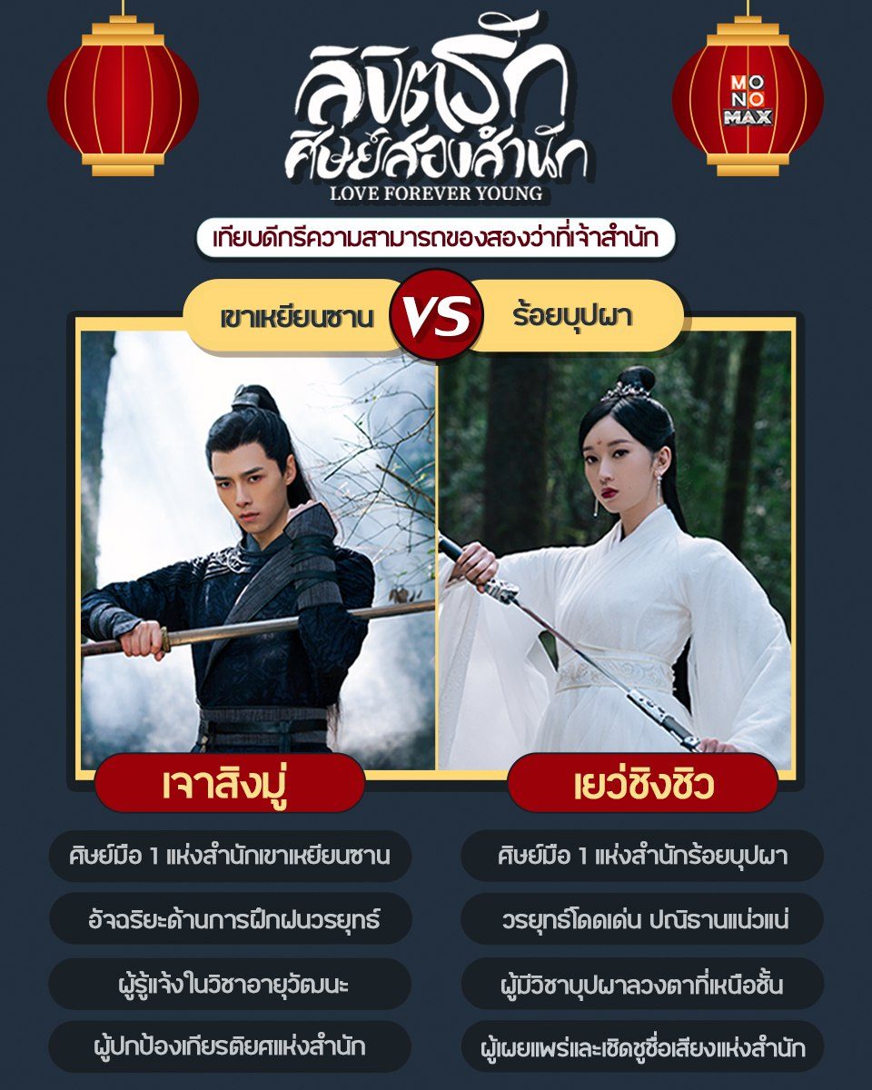 เนื่องจากความแค้นที่มีมายาวนานกว่า 100 ปี ทำให้ทั้งสองสำนักต้องฝึกฝนลูกศิษย์ให้มีวิชาวรยุทธ์ที่เก่งกาจ และเตรียมพร้อมที่จะต่อสู้! วันนี้เราจึงพามาเปรียบเทียบดีกรีความสามารถของศิษย์ว่าที่เจ้าสำนักเขาเหยียนซานและร้อยบุปผา ว่าจะเก่งกาจกันสักเพียงไหน!! ตามมารับชมซีรีส์จีน "ลิขิตรักศิษย์สองสำนัก Love Forever Young" ในแบบฉบับพากย์ไทย-ซับไทยได้ที่ MONOMAX