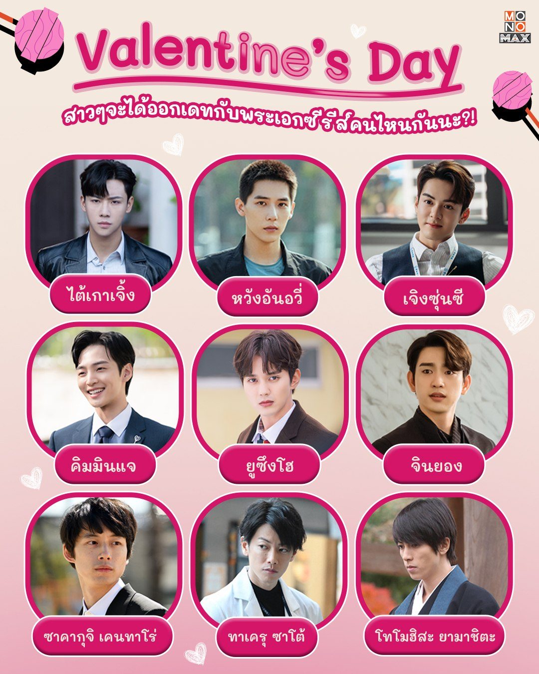 สาวโสดจะไม่เหงาอีกต่อไป เมื่อมีเหล่าพระเอกซีรีส์ของเราเคียงข้างในวันวาเลนไทน์ มาร่วมสนุกไปพร้อมๆกับพวกเขาได้ในซีรีส์หลากรส ที่จะพาแฟนๆไปฟินกับความรักที่แสนละมุนใจ ว่าแต่จะมีพระเอกคนไหนโดนใจแฟนๆซีรีส์บ้างมั้ยนะ?! ตามมารับชมผลงานซีรีส์ของพวกเขาได้ในแบบฉบับพากย์ไทย-ซับไทยที่ MONOMAX