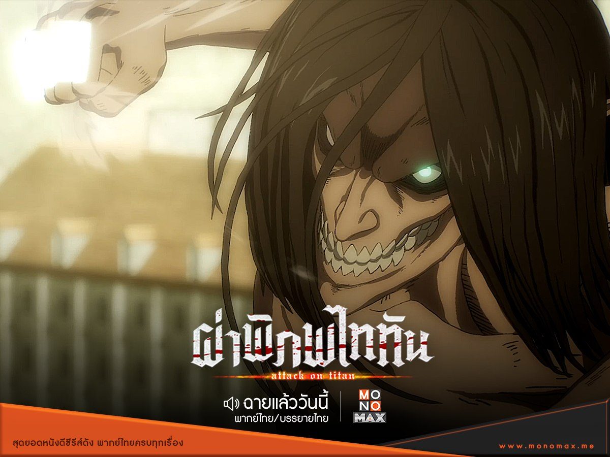 "ผ่าพิภพไททัน" (Attack on Titan) อนิเมะสร้างจากมังงะญี่ปุ่นชื่อดัง ผลงานการแต่งเรื่องและวาดภาพประกอบของ ฮาจิเมะ อิซายามะ เรื่องราวเกี่ยวกับโลกมนุษย์ที่ถูกคุกคามจากเหล่าสิ่งมีชีวิตขนาดใหญ่มหึมาที่เรียกว่า "ไททัน" บทสรุปแล้วมนุษยชาติจะสูญสิ้นไปหรือไม่ มาร่วมลุ้นไปพร้อม ๆ กัน สามารถรับชมเสียงไทยและซับไทยครบทุกตอนได้ที่ MONOMAX