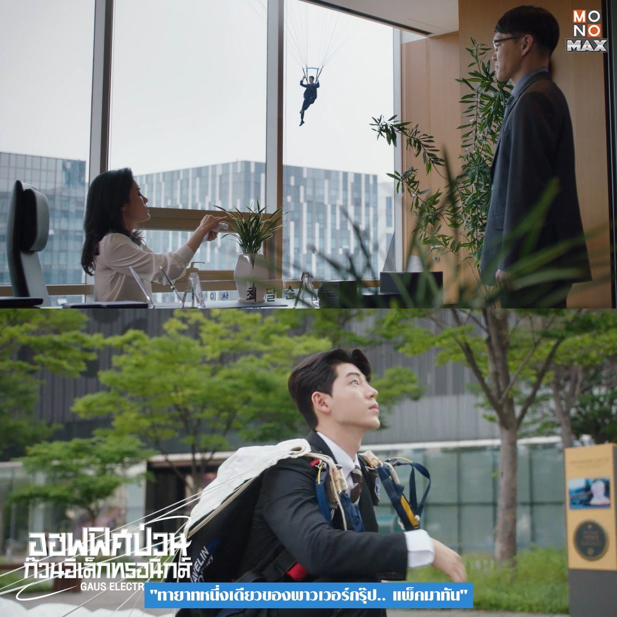 วันแรกในการเริ่มงานที่บริษัทเครื่องใช้ไฟฟ้า 'เกาส์ อิเล็กทรอนิกส์' ก็ต้องมาให้สมฐานะทายาทหนึ่งเดียวของพาวเวอร์กรุ๊ป นั่งรถมาดูธรรมดาไป งานนี้แพ็คมาทันเลยเลือกโดดร่มมาทำงานซะเลย
