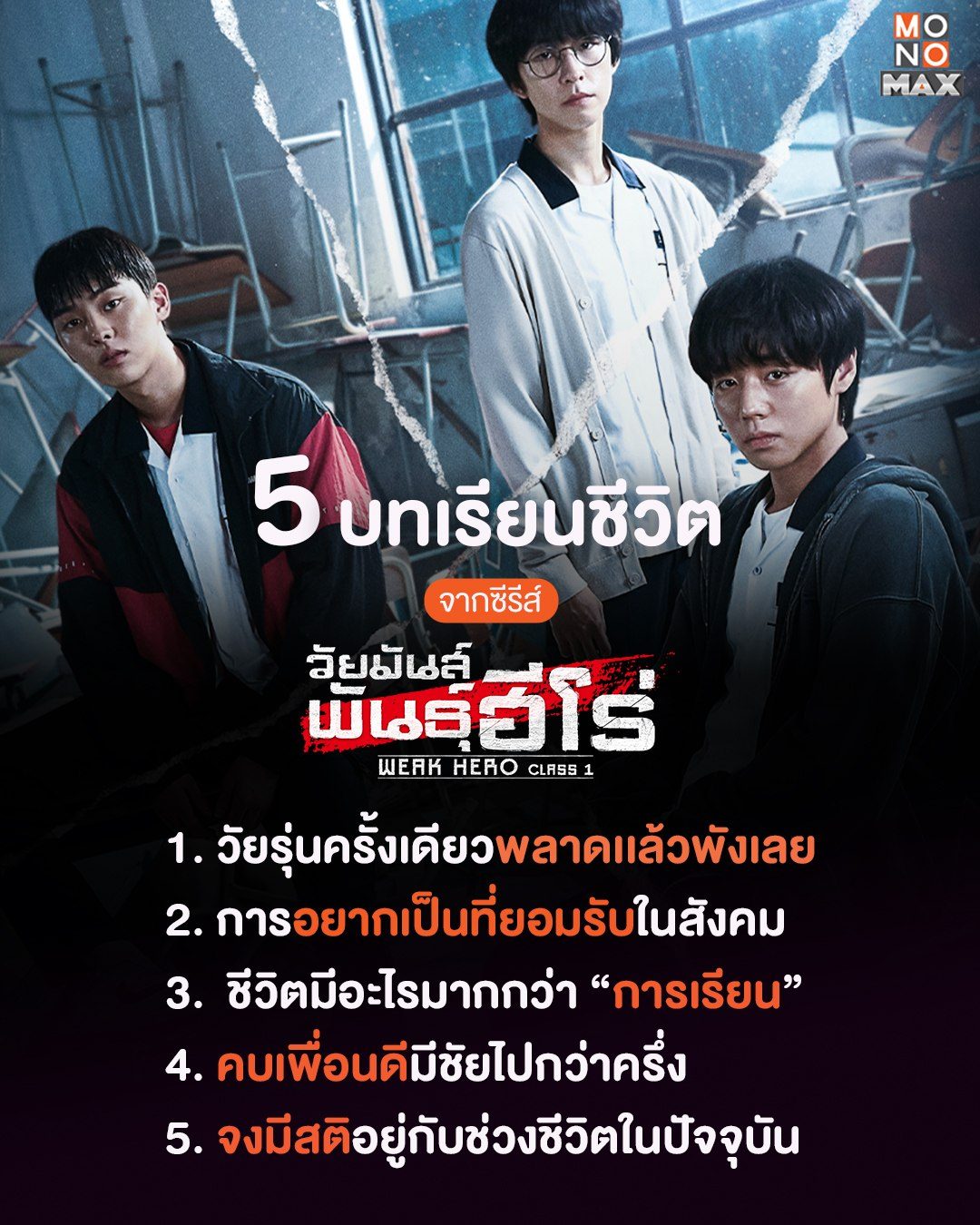 เพราะความคึกคะนองเป็นเหตุสังเกตได้! หากมีใครถามว่าช่วงวัยไหนที่เราสนุกและมีความสุขมากที่สุด คงมีใครหลาย ๆ คนตอบว่า "ช่วงวัยรุ่น" กันเเน่นอน แต่ทว่าชีวิตวัยรุ่นของคนเรามันไม่ได้มีเเค่ความสนุกสมวัยเพียงอย่างเดียว วัยรุ่นหลาย ๆ คนมักมีเรื่องทุกข์ใจซุกซ่อนอยู่ ถือว่าเป็นช่วงวัยของการปรับตัวและลองผิดลองถูกในหลาย ๆ เรื่องมากมาย ซึ่งซีรีส์ "วัยมันส์พันธุ์ฮีโร่ Weak Hero Class 1" เป็นซีรีส์วัยเรียน แนวแอคชั่น-ดราม่า ดัดแปลงจากเว็บตูนในชื่อเดียวกัน ผลงานของนักเขียน SEOPASS และ คิมจินซอก ที่จะตีเเผ่เรื่องราวชีวิตช่วงวัยรุ่นโดยฝากเเง่คิดดี ๆ อยู่ไม่น้อยเลย วันนี้เราจึงถือโอกาสหยิบยก 5 บทเรียนชีวิตช่วงวัยรุ่นจากซีรีส์ "วัยมันส์พันธุ์ฮีโร่ Weak Hero Class 1" ตามไปดูและติดตามความสนุกแบบฉบับพากย์ไทย-ซับไทย ครบทุกตอนได้ที่ MONOMAX