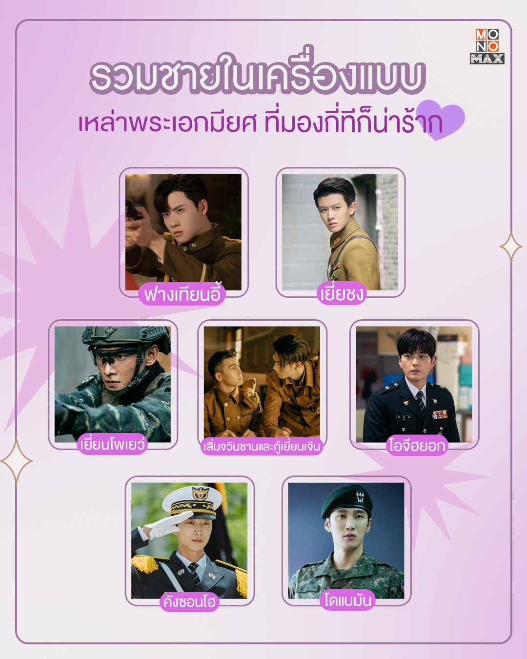 เอาใจคนรักชายในเครื่องแบบ กับพระเอกหนุ่มที่ใส่ชุดเครื่องแบบแล้วดุดัน! สุขุมและน่าค้นหายิ่งกว่าเดิม! บอกเลยว่าความเท่ของพวกเขากินกันไม่ลงจริงจริ๊งงง จะมีหนุ่มฮ็อตจากเรื่องไหนกันบ้าง? ตามไปดูและติดตามซีรีส์แบบฉบับพากย์ไทย-ซับไทยของพวกเขาได้ที่ MONOMAX