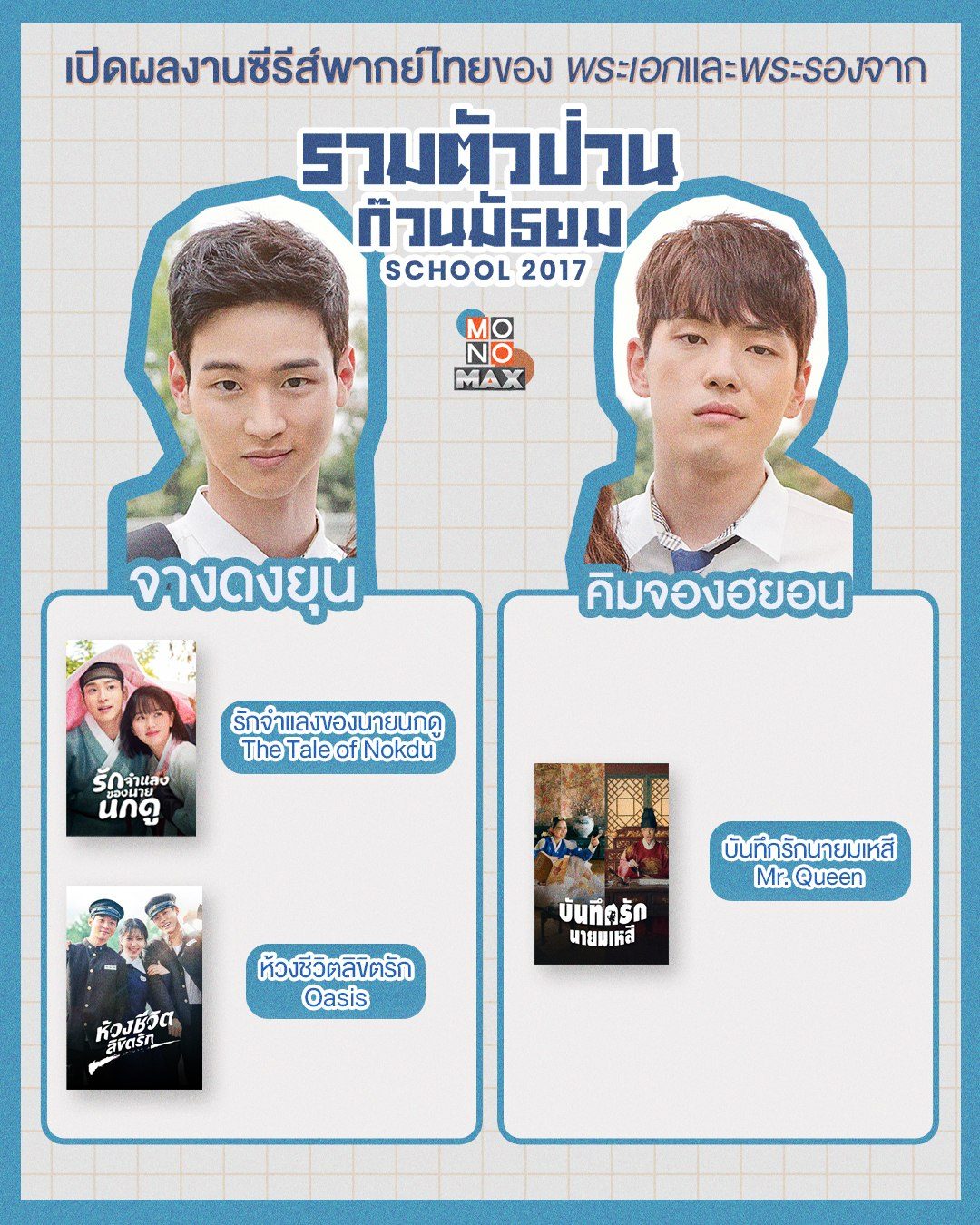 พาส่องผลงานซีรีส์พากย์ไทยเรื่องอื่น ๆ บน Monomax ของ ฮยอนแทอุน (คิมจองฮยอน) ลูกชายผู้อำนวยการโรงเรียนจอมเกเร และประธานนักเรียน ซงแดฮวี (จางดงยุน) สองหนุ่มพระเอกและพระรองจากซีรีส์ไฮสคูลเกาหลีเรื่องดัง รวมตัวป่วนก๊วนมัธยม School 2017 จะมีผลงานห้ามพลาดชมเรื่องใดอีกบ้าง? ตามไปดูและสตรีมพากย์ไทยได้ทุกเรื่องที่ Monomax