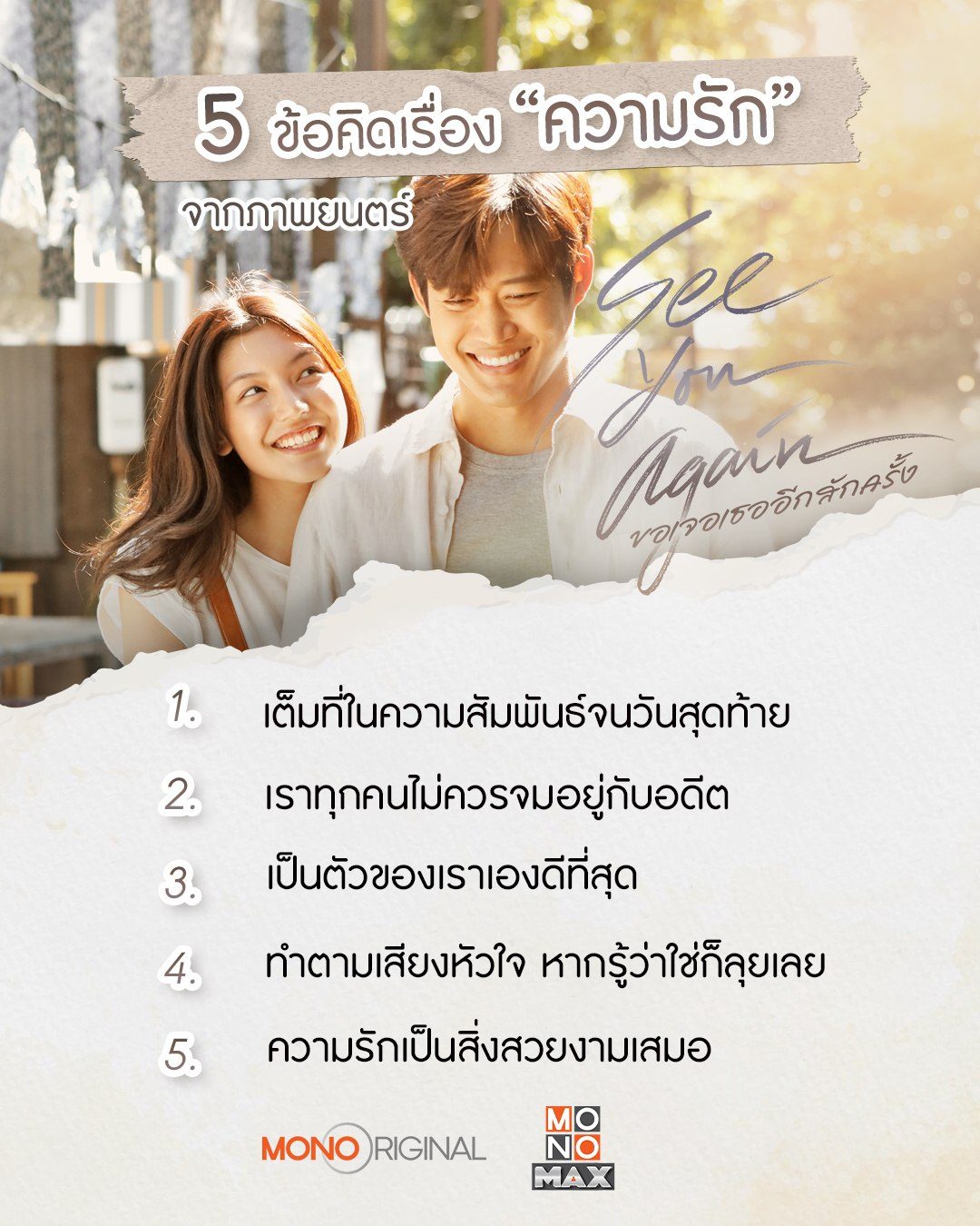 รวมข้อคิดดี ๆ ที่จะทำให้คุณเข้าใจคำว่า "รัก" มากยิ่งขึ้นจาก "วันใหม่" และ "ไท" แม้ความรักจะต่างวัยแต่หัวใจเราตรงกัน... ติดตามรับชมภาพยนตร์รักอบอุ่นใจใน "ขอเจอเธออีกสักครั้ง See You Again" นำแสดงโดย ตู่ ภพธร และ สตาร์ ศรัณย์ลภัส สามารถรับชมได้แล้ววันนี้ทาง MONOMAX เท่านั้น!